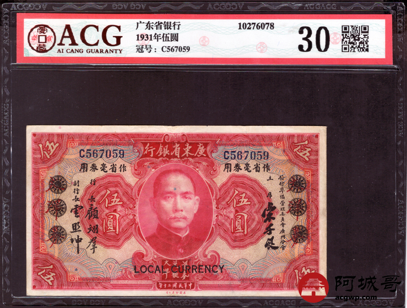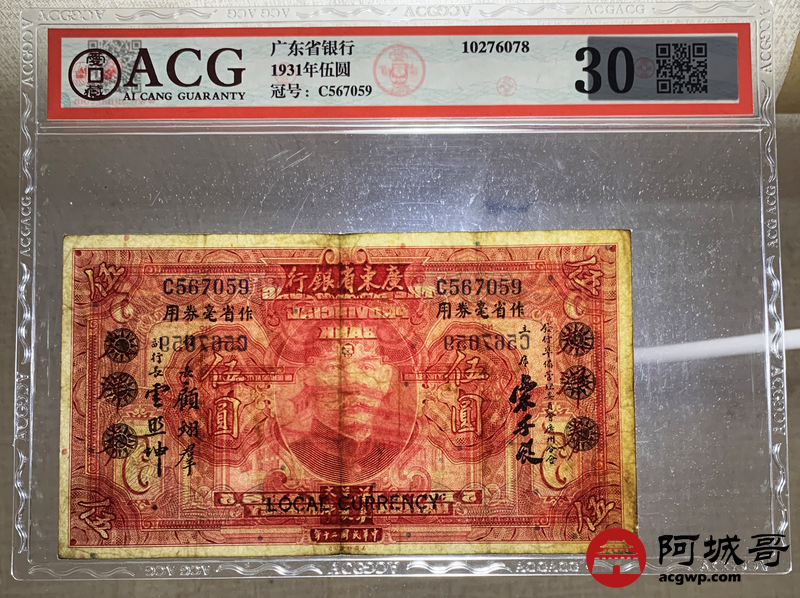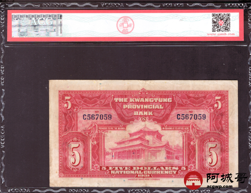 Lot:67 民国20年 广东省银行 伍圆 ACG 30
