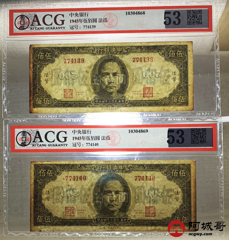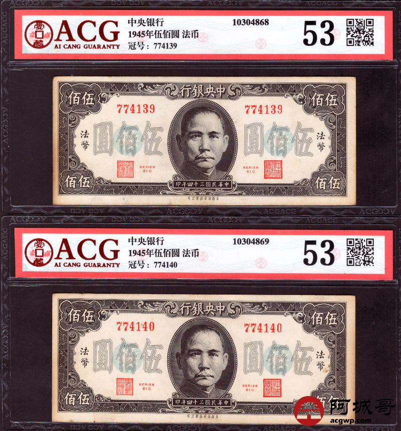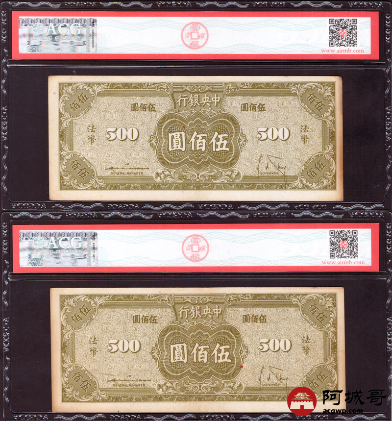 Lot:63 民国34年 中央银行 伍佰圆 ACG 53 两张一组
