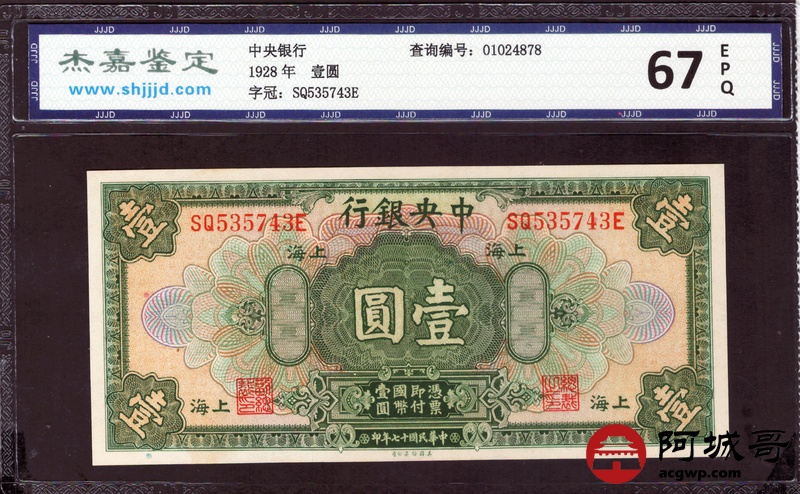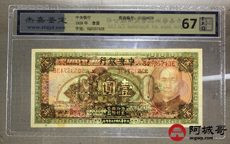 Lot:34 民国17年 中央银行 上海壹圆 杰嘉鉴定 67EPQ