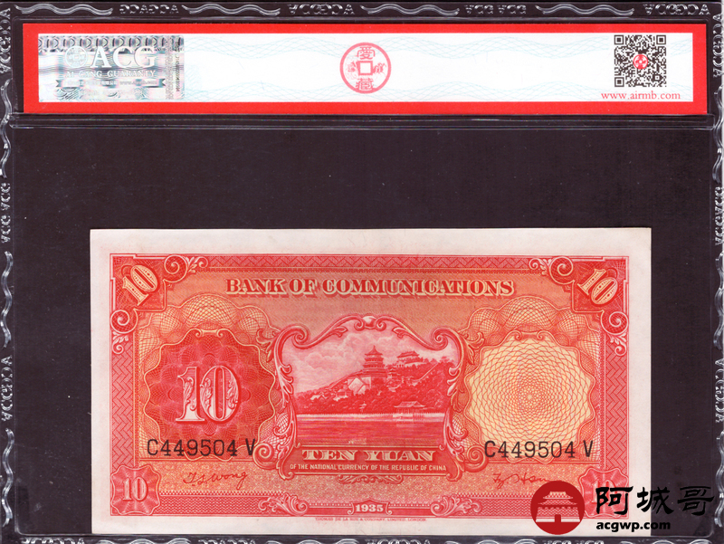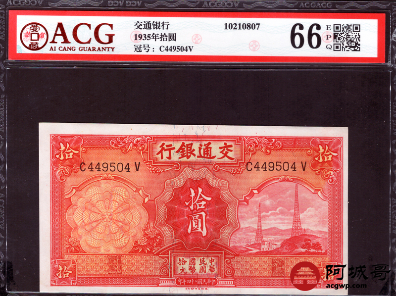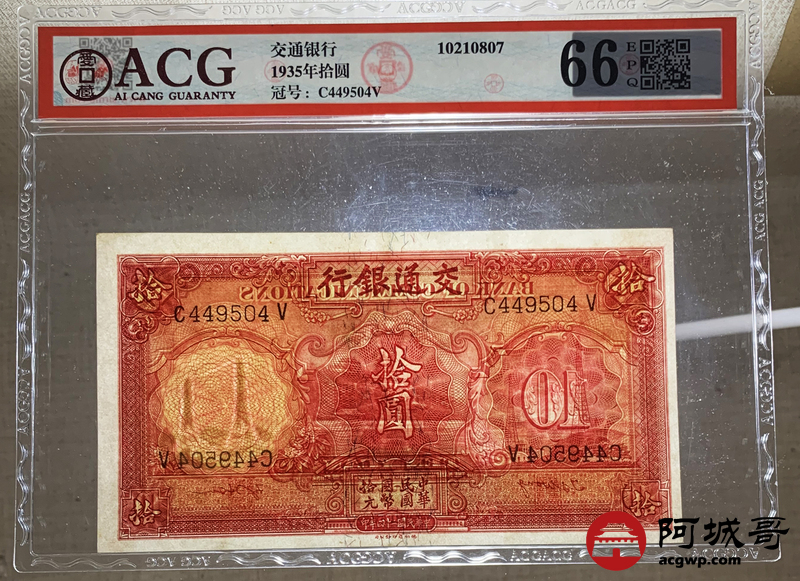 Lot:21 民国24年 交通银行 拾圆 ACG 66EPQ