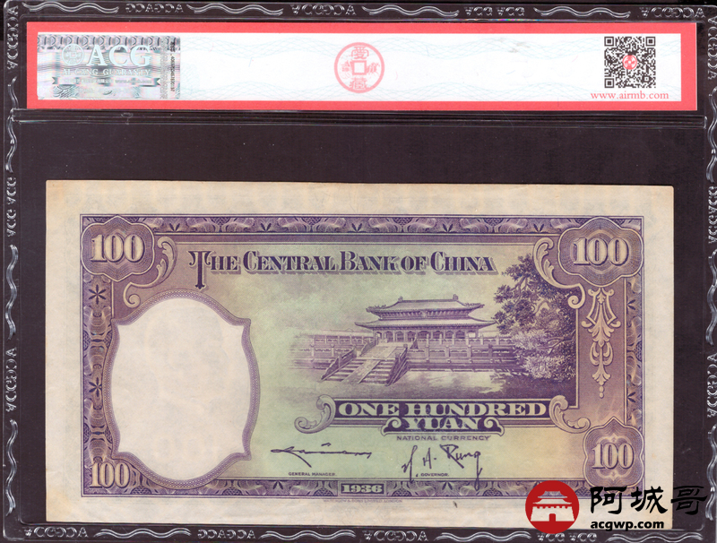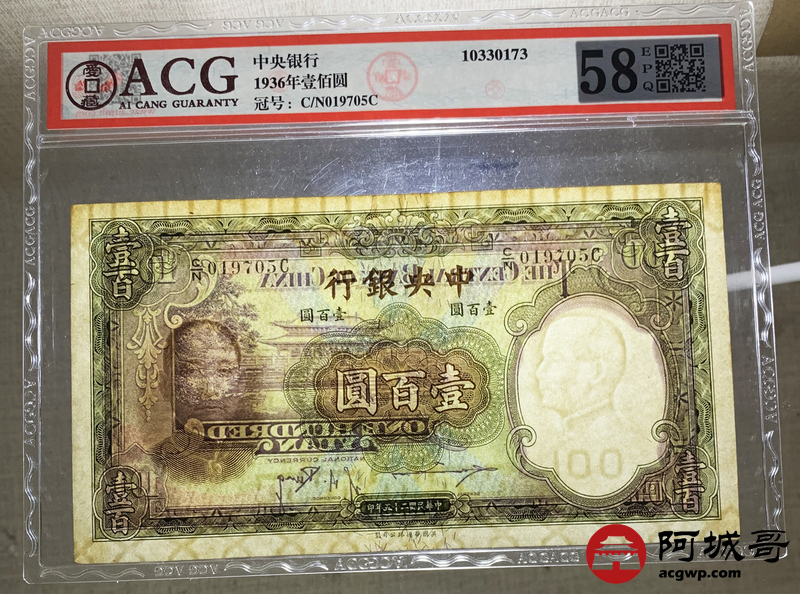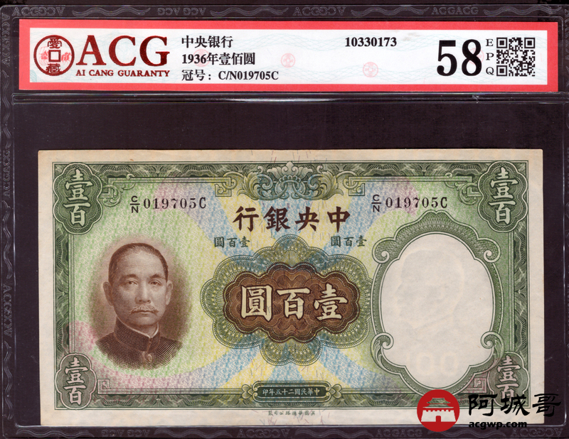 Lot:58 民国25年 中央银行 壹佰圆 ACG 58EPQ