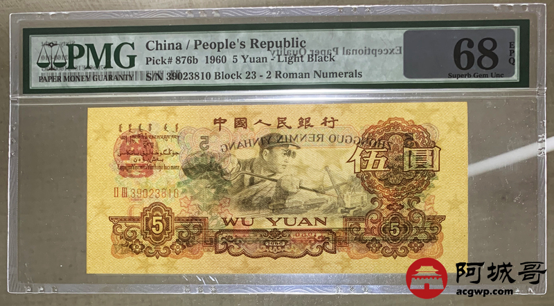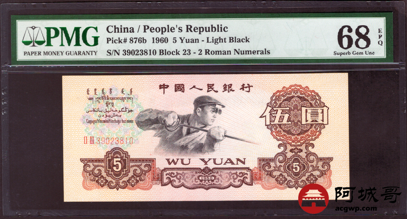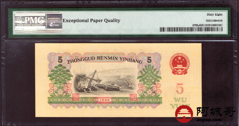 Lot:18 三版 1960年 伍圆炼钢工人 PMG 68EPQ 季军分 好号无47 PMG 68EPQ