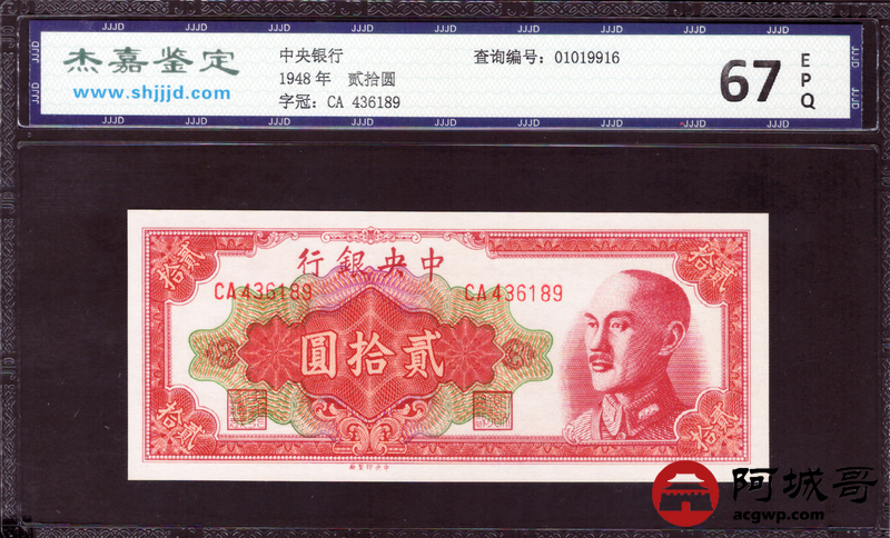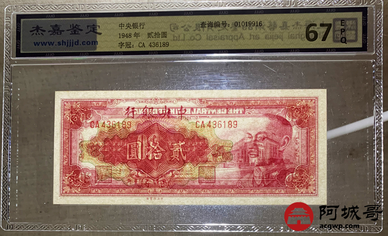 Lot:27 1948年 中央银行 贰拾圆 杰嘉评级 67EPQ