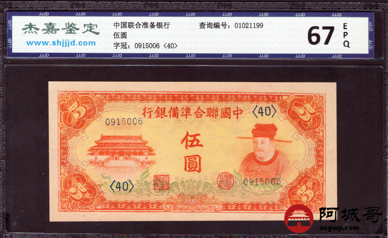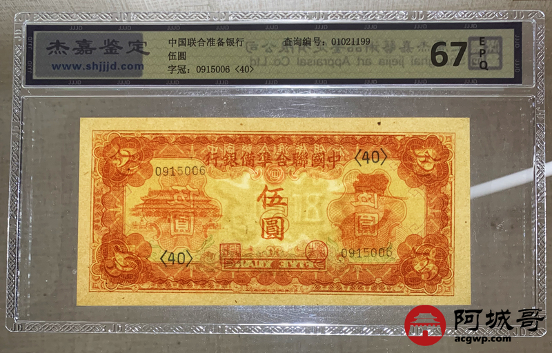 Lot:47 中国联合准备银行 伍圆 杰嘉评级 67EPQ