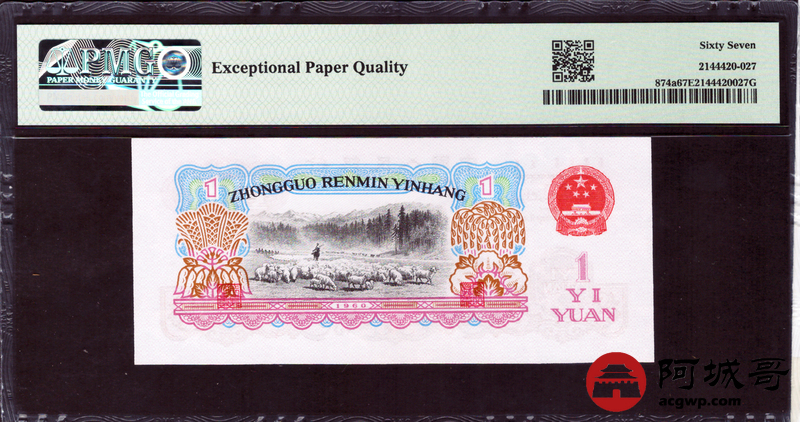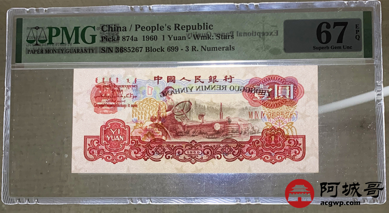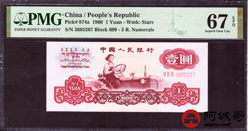 Lot:54 三版 1960年 拖拉机手壹圆 PMG 67EPQ 好号无4