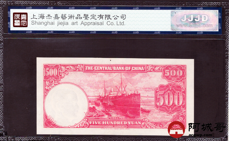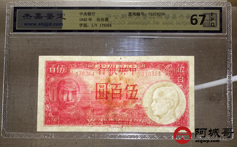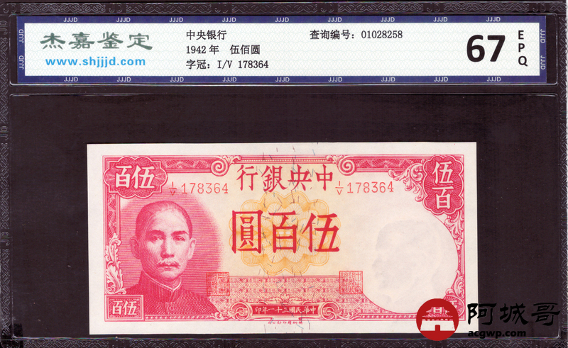 Lot:20 民国31年 中央银行 伍佰圆 杰嘉评级 67EPQ