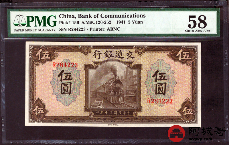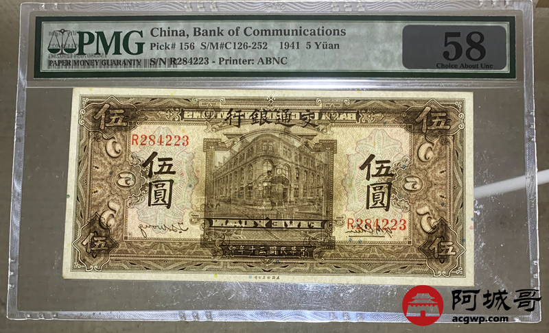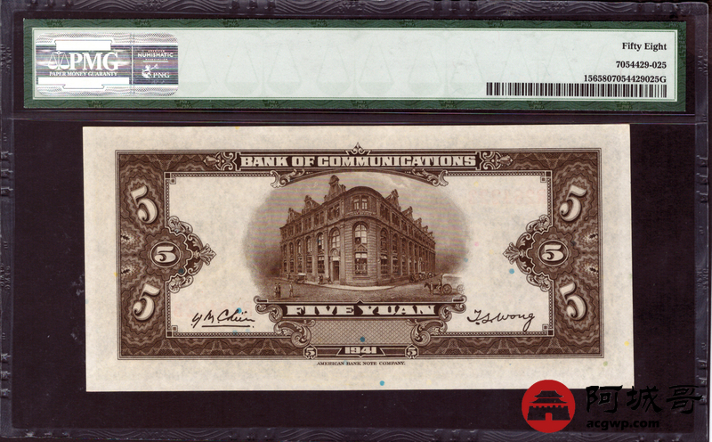 Lot:44 民国30年 交通银行 伍圆 PMG 58
