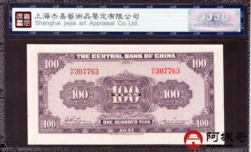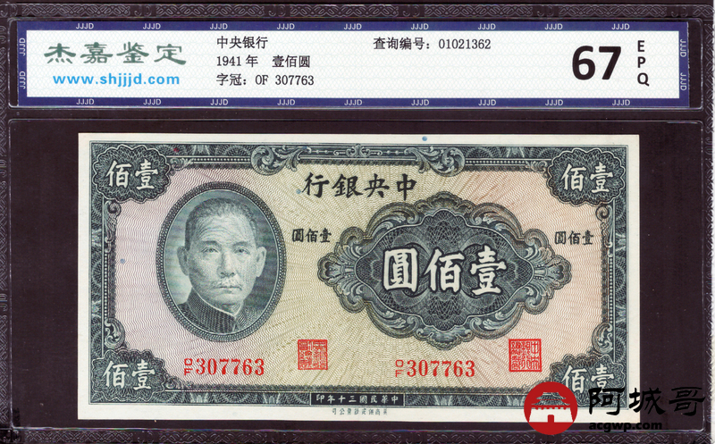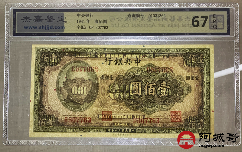 Lot:1 民国30年 中央银行 壹佰圆 杰嘉评级 67EPQ