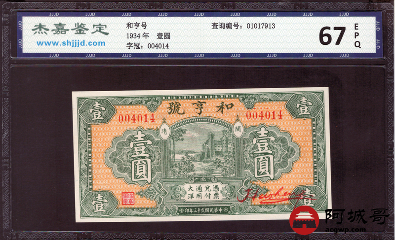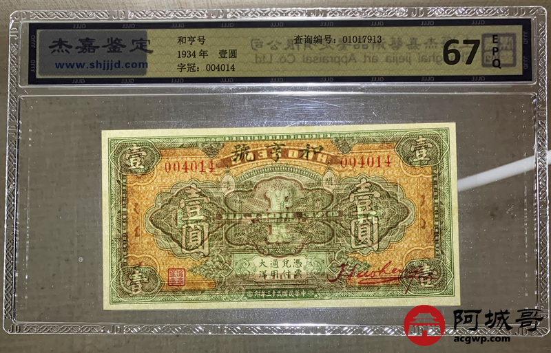 Lot:65 民国23年 和亨号 壹圆 杰嘉评级 67EPQ