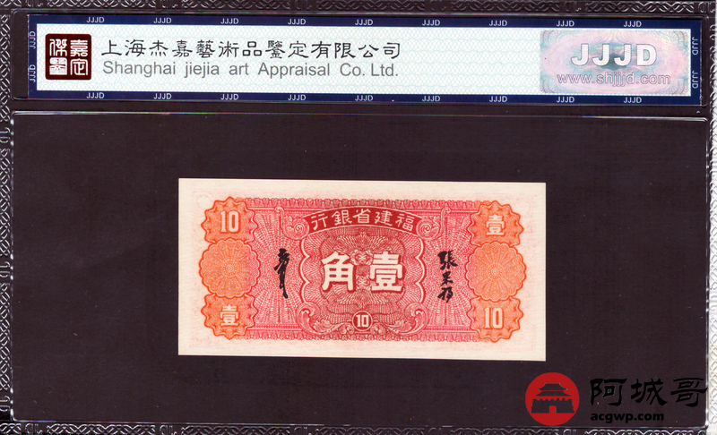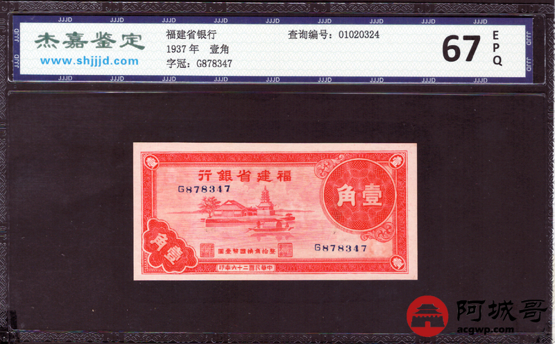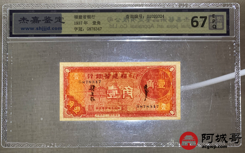 Lot:66 民国26年 福建省银行 壹角 杰嘉评级 67EPQ