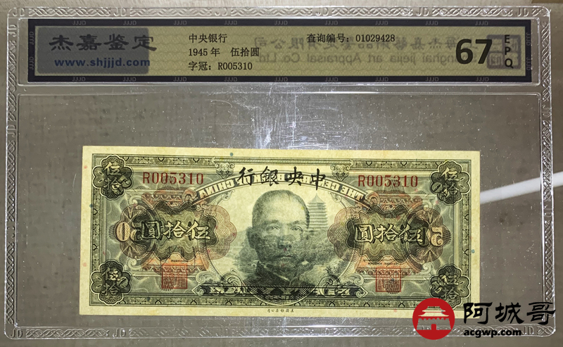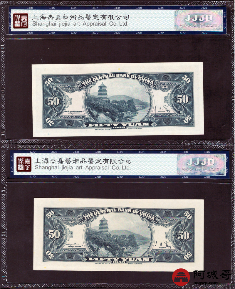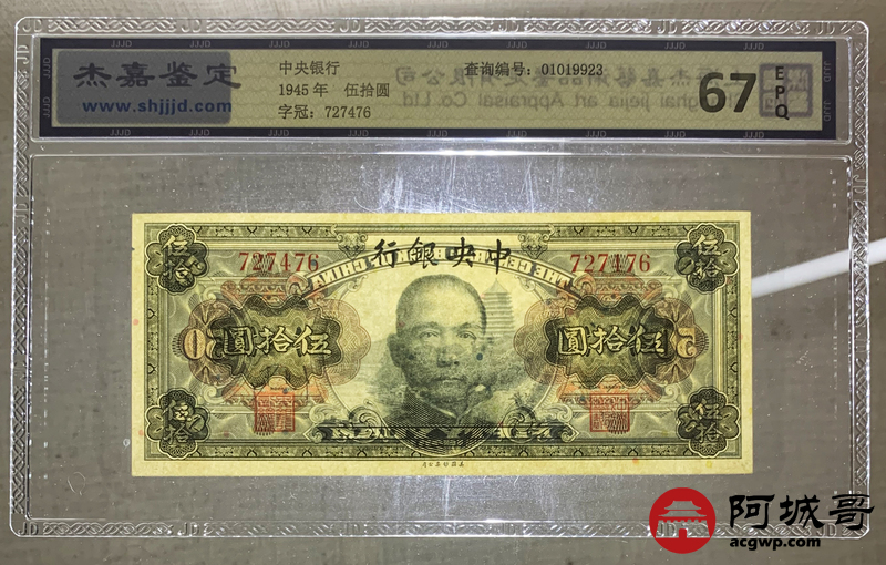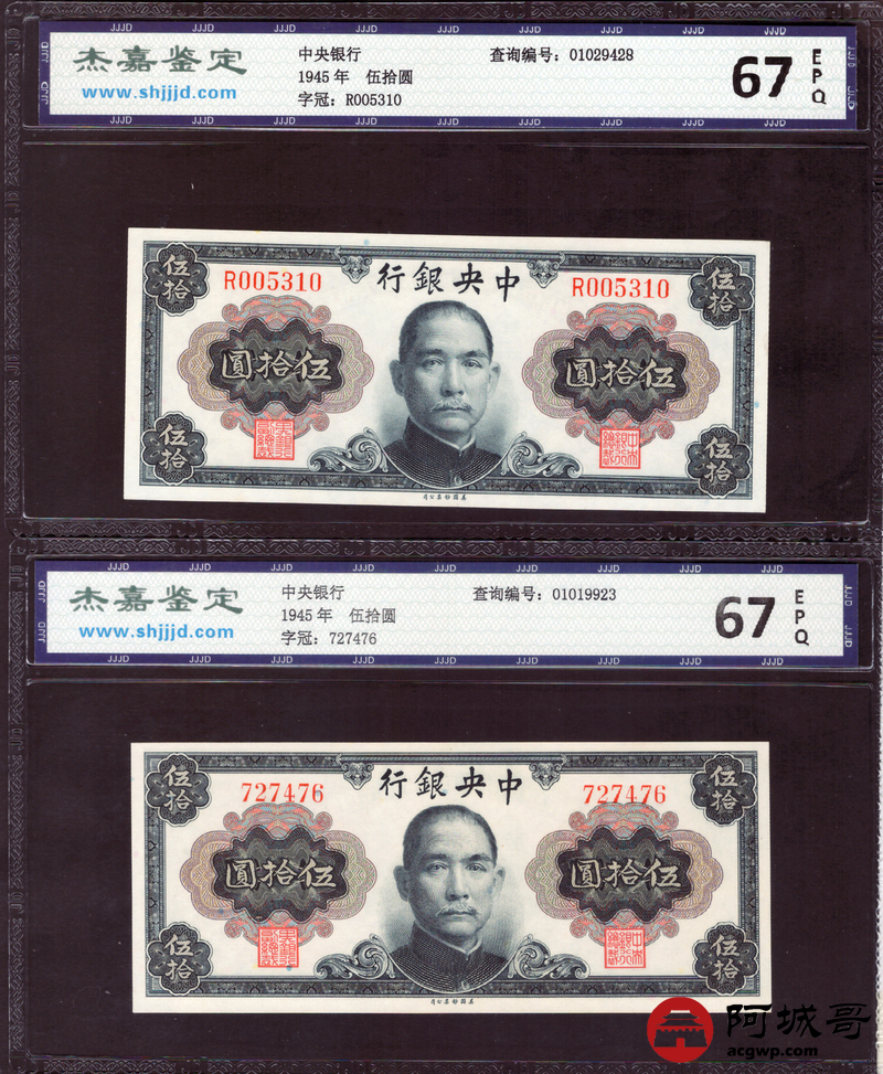 Lot:37 1945年 中央银行 伍拾圆 杰嘉评级 67EPQ 两张一组