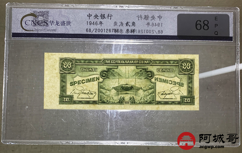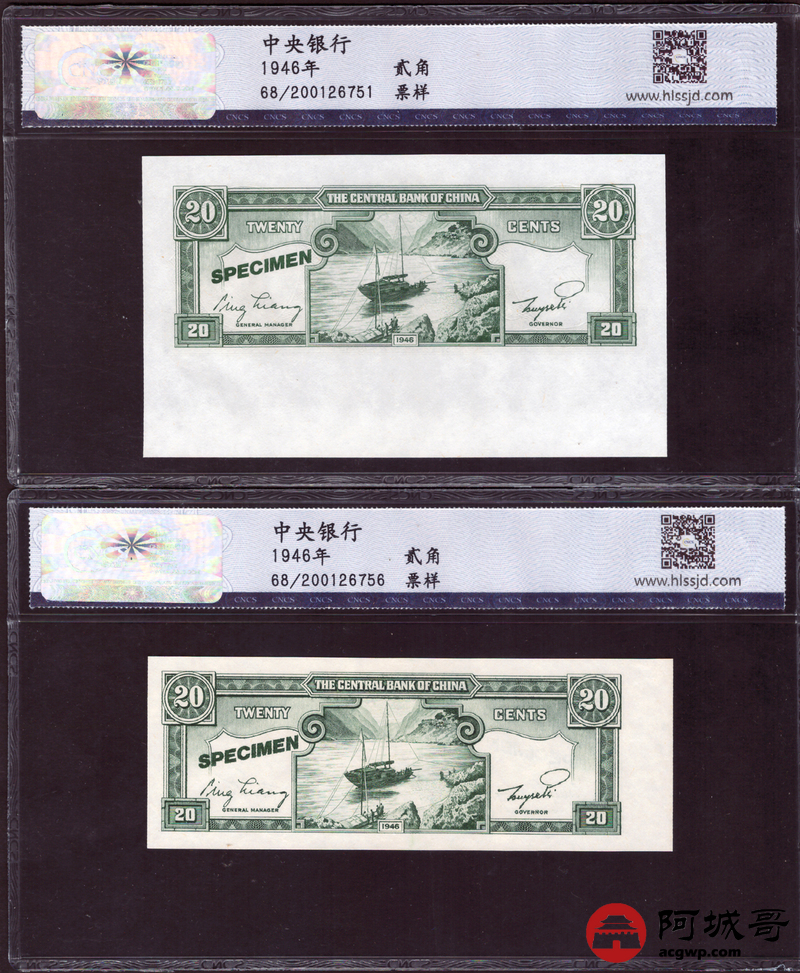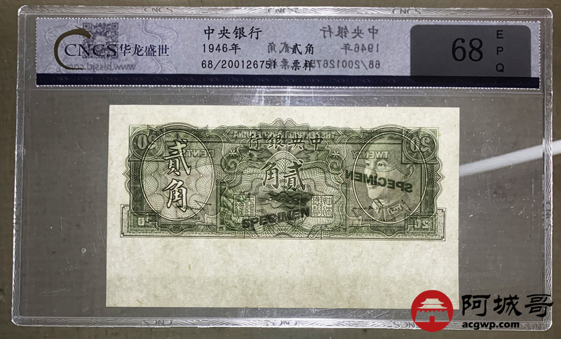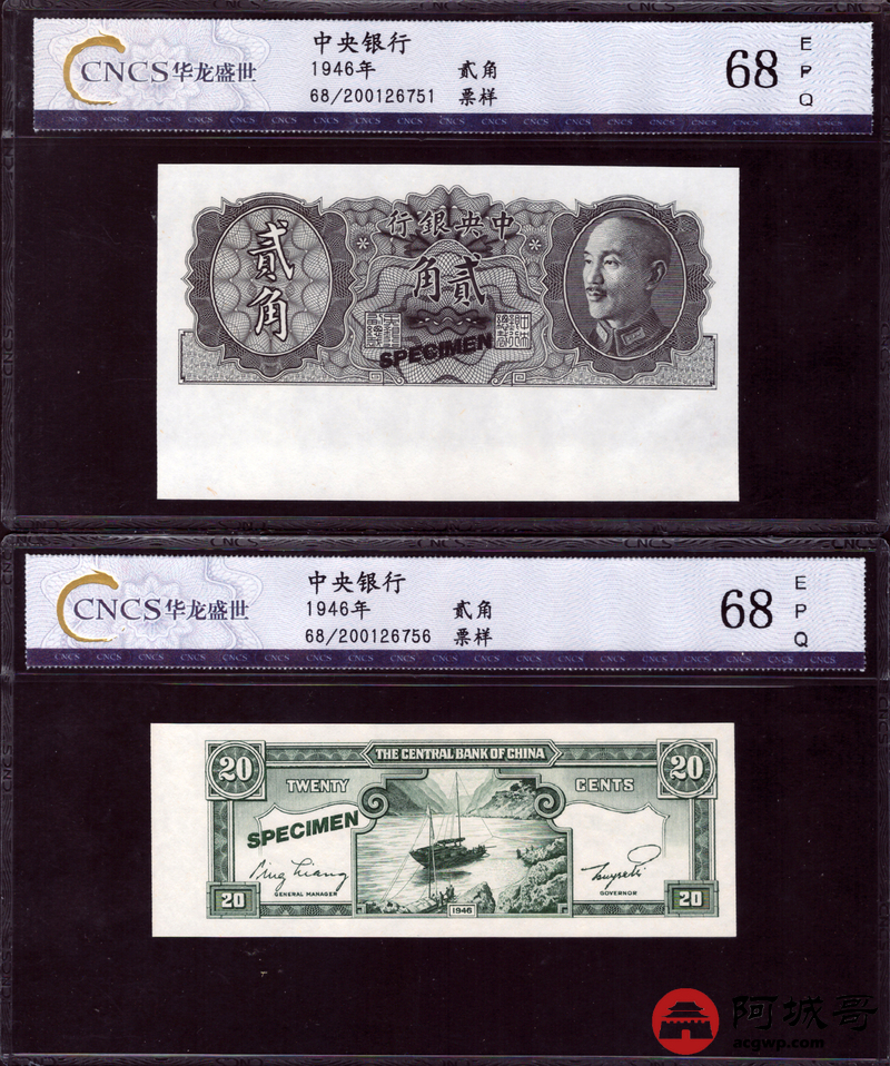 Lot:38 1946年 中央银行 贰角 票样 CNCS 68EPQ 两张一组