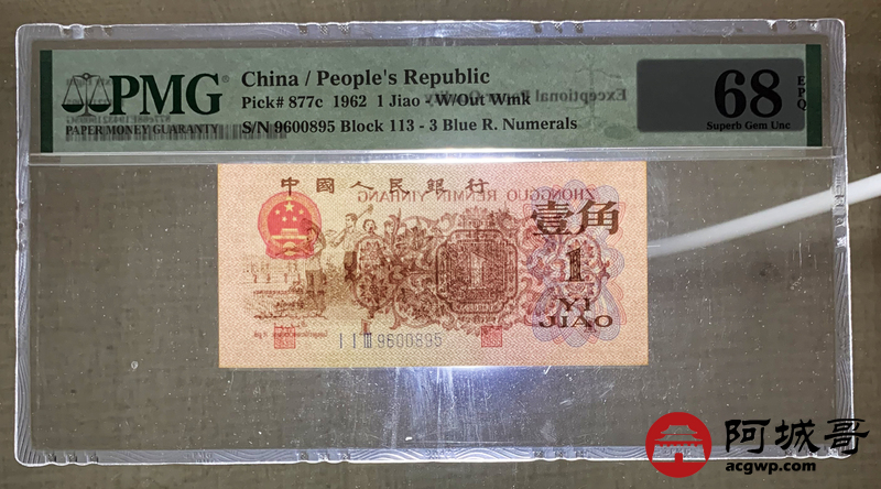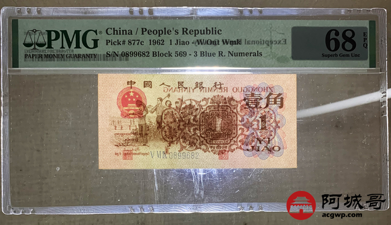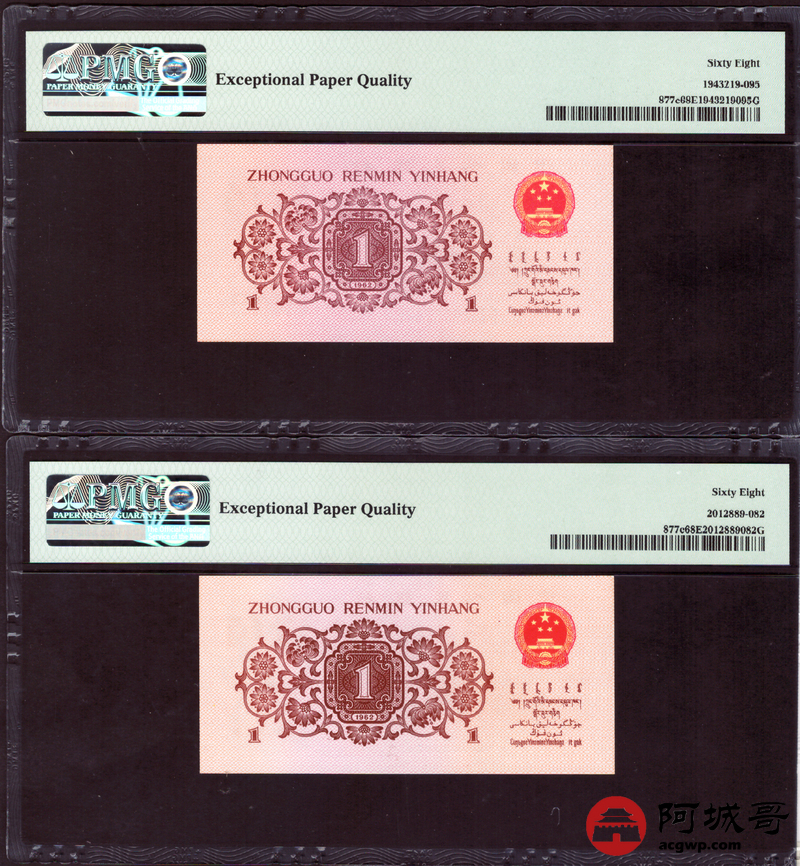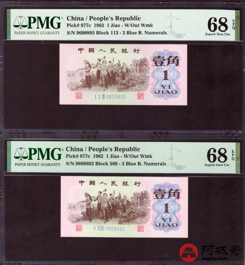 Lot:68 三版 1962年 壹角 PMG 68EPQ 两张一组 好号无347 其中有一张朦胧号