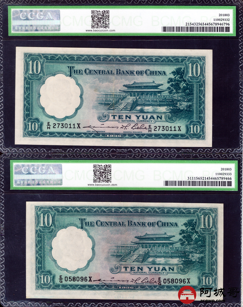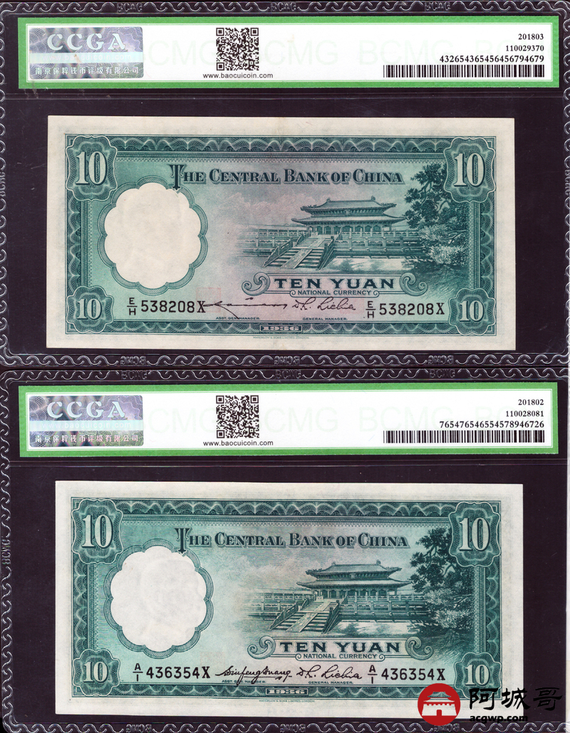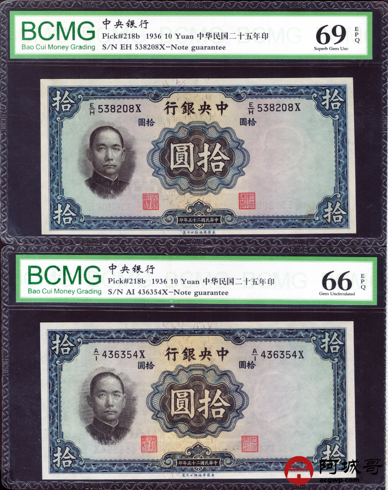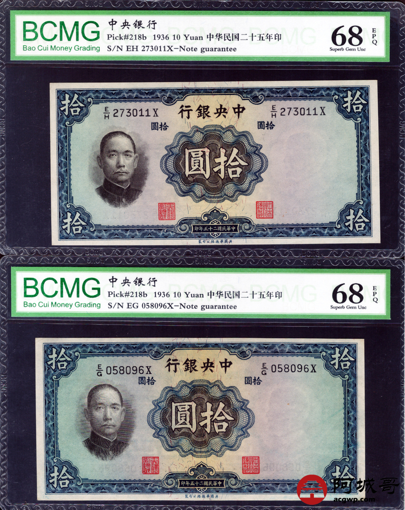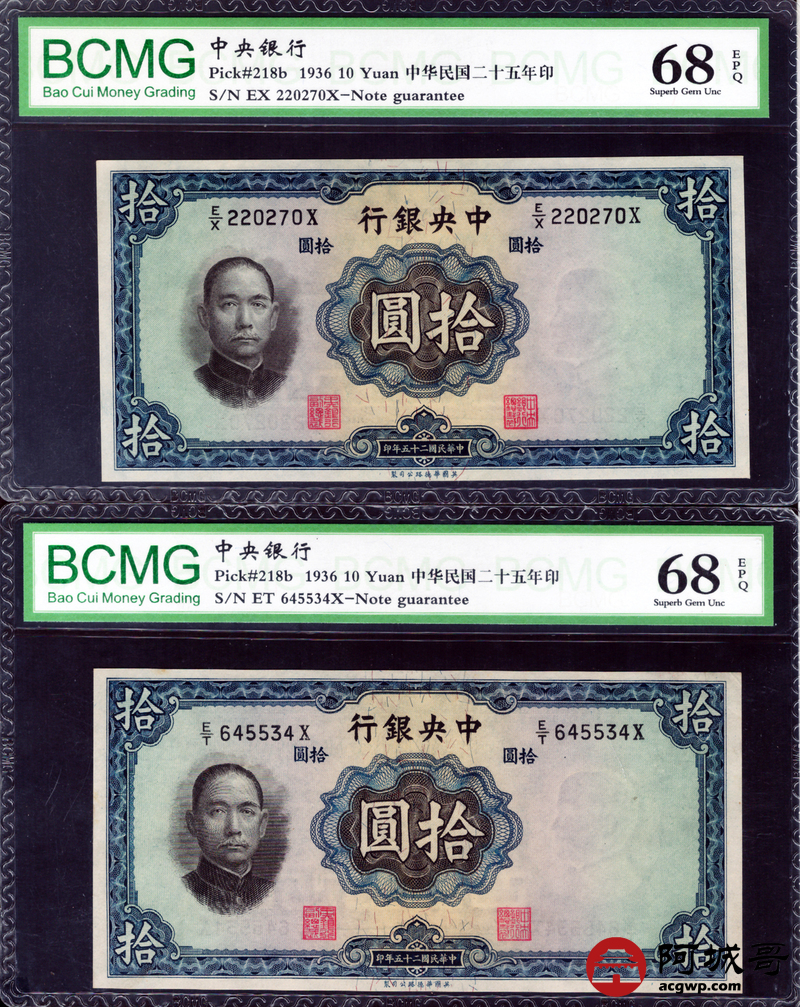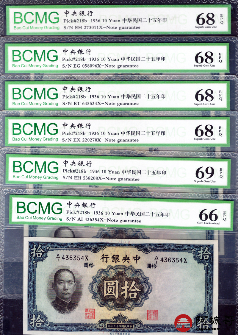 Lot:59 民国25年 中央银行 拾圆 BCMG 66EPQ、 68EPQ 、69EPQ 六张一组