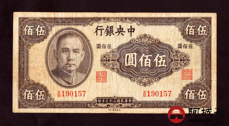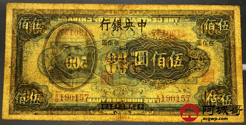 Lot:50 民国三十三年 中央银行 伍佰圆 7成新