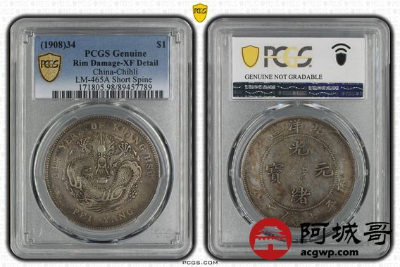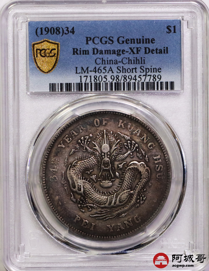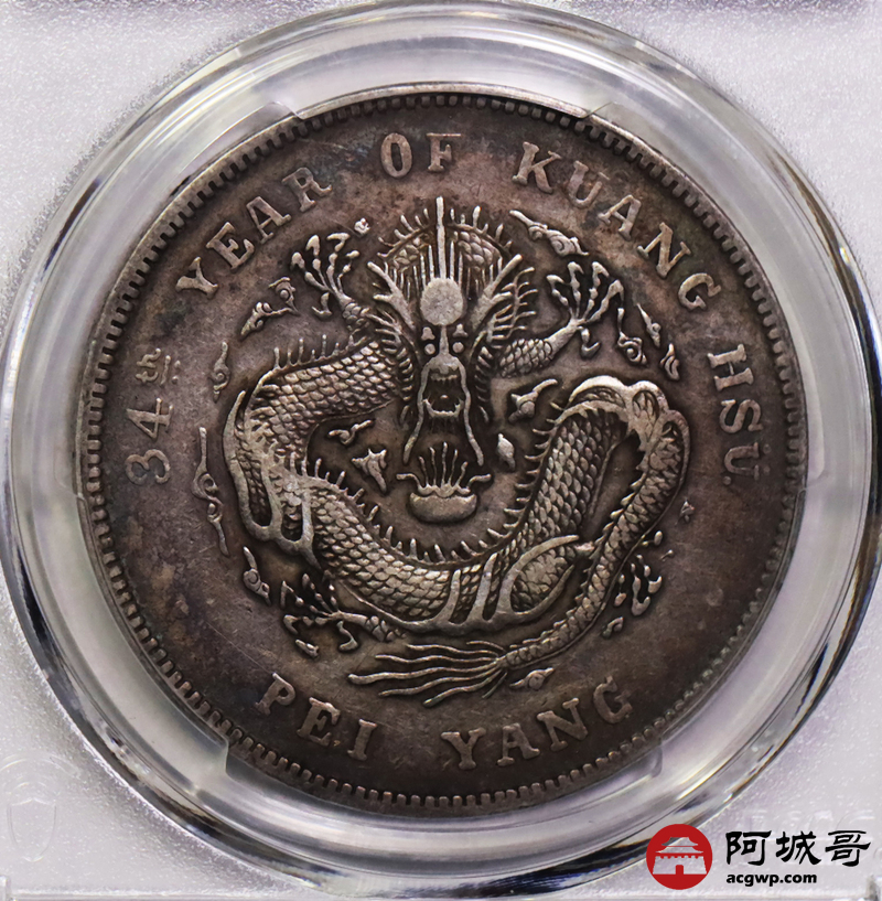 Lot:26 酱彩包浆 北洋34七钱二分 短尾龙 PCGS XF