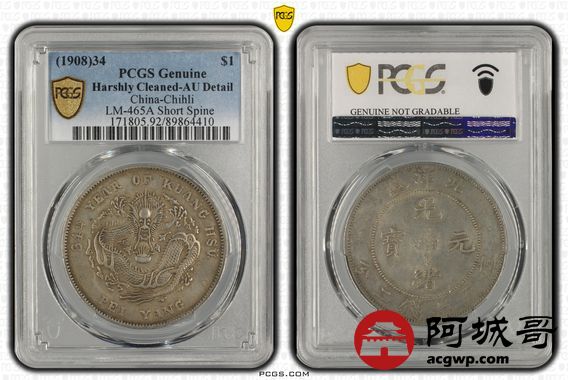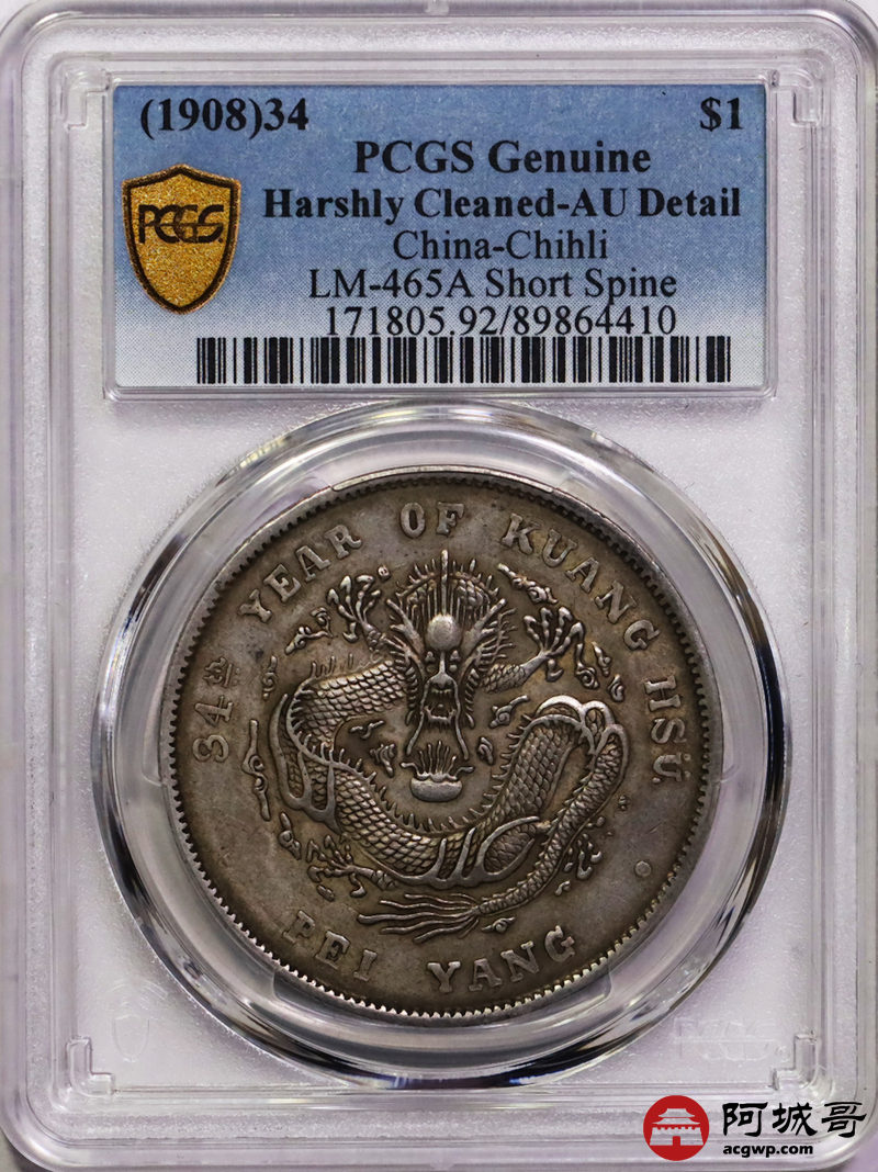Lot:24 原味深打 北洋34七钱二分 短尾龙 PCGS AU