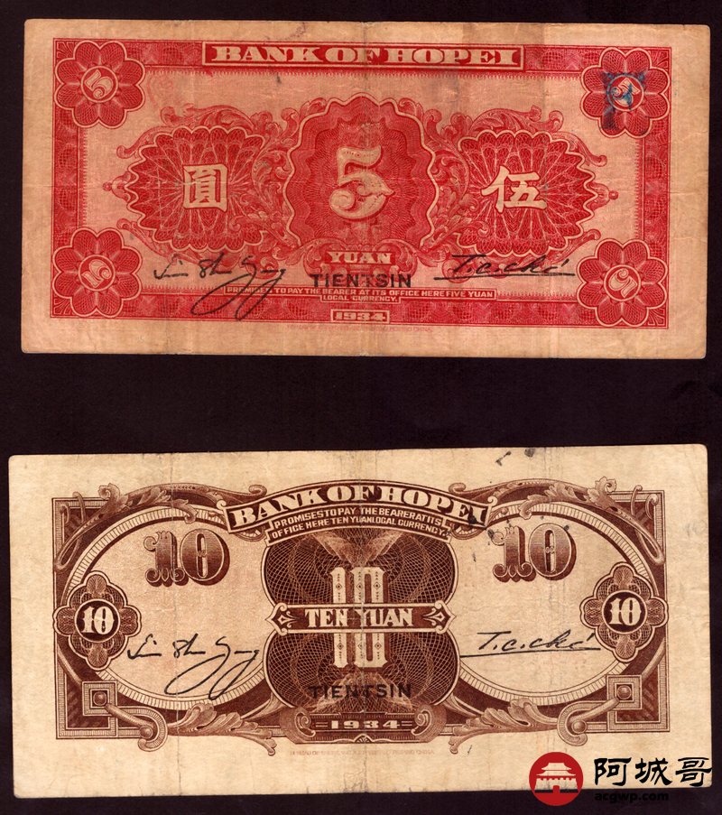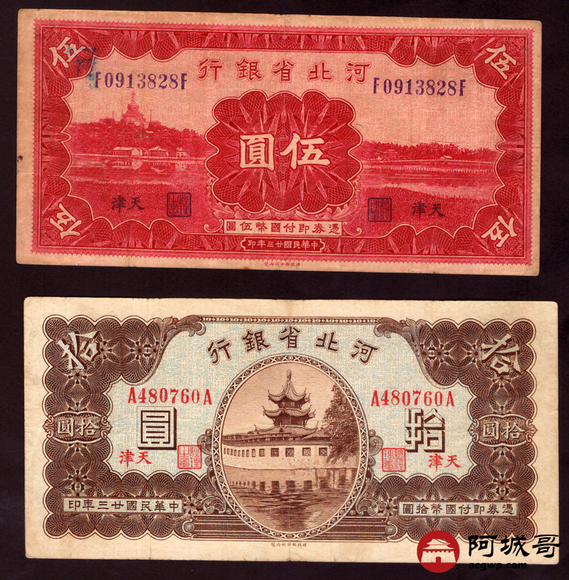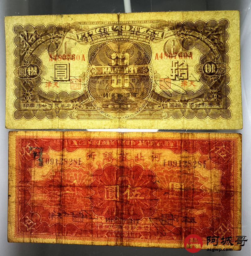 Lot:51 民国23年 河北省银行 伍圆、拾圆 2张 69至7成新