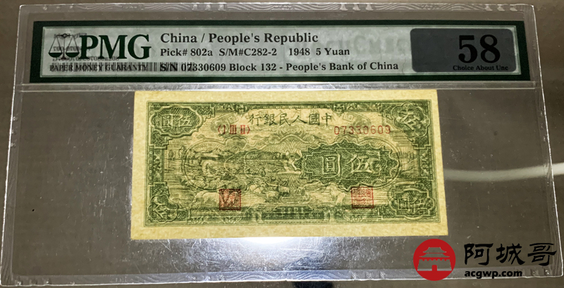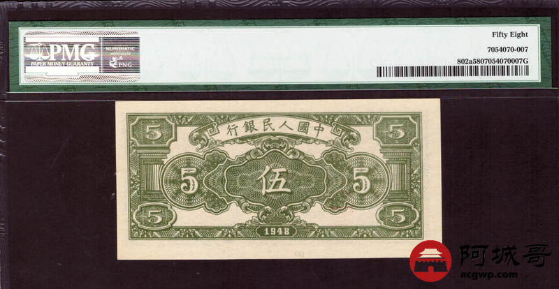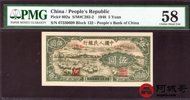 Lot:28 一版 民国37年 伍圆小绵羊 PMG 58 好号无4