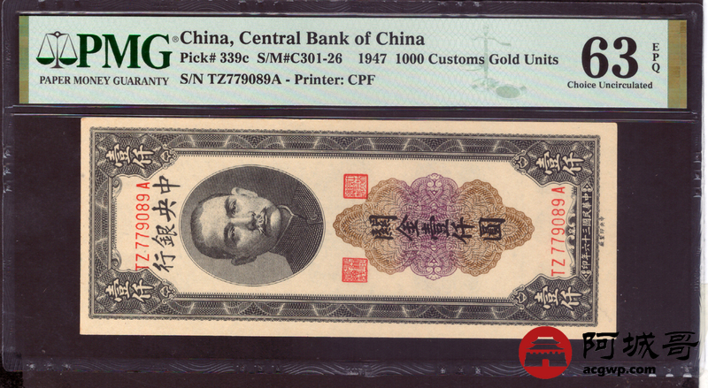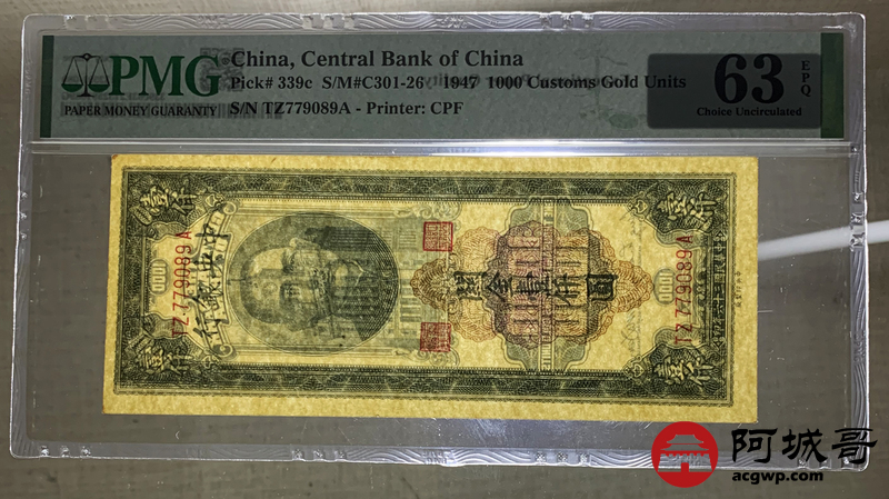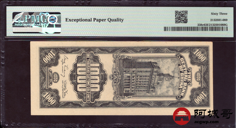 Lot:31 民国36年 中央银行 关金壹仟圆 PMG 63EPQ 前后冠字,较少见