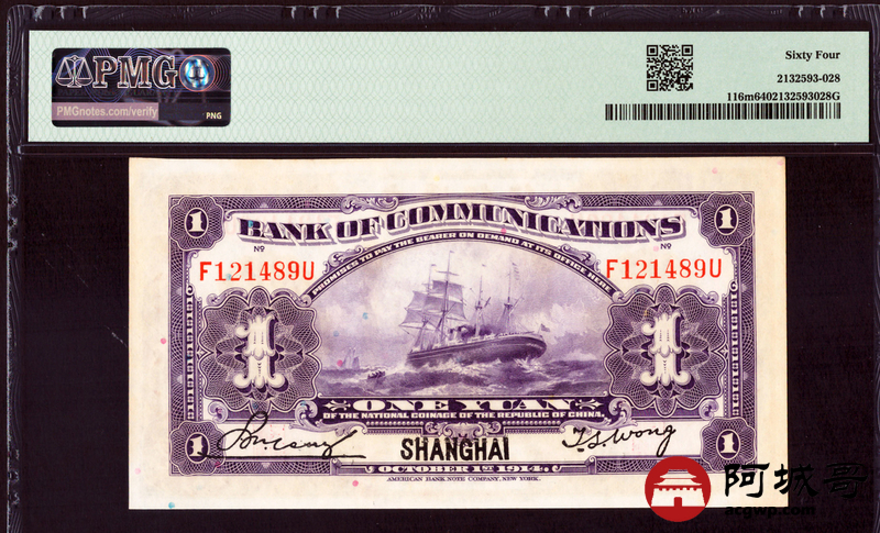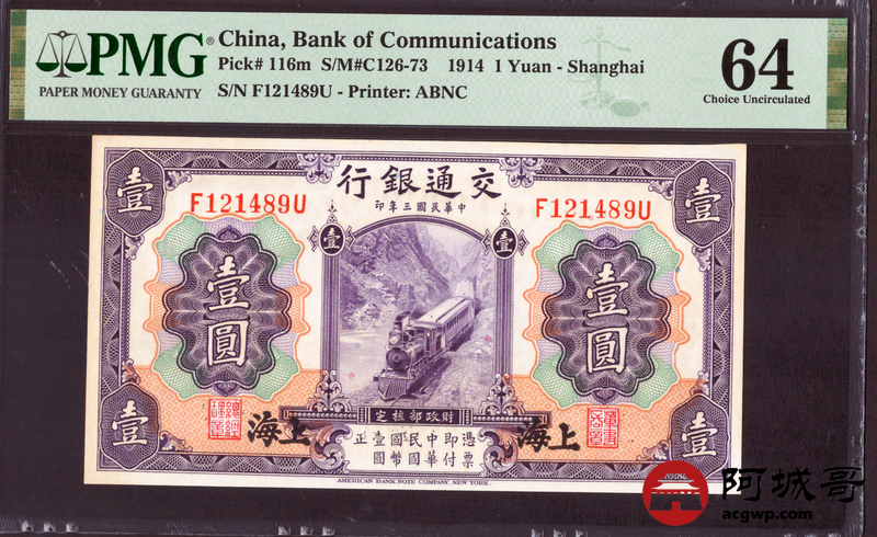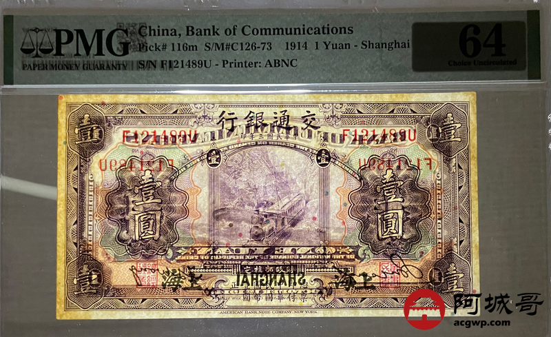 Lot:44 民国3年 交通银行 壹圆 黑上海地名 PMG 64