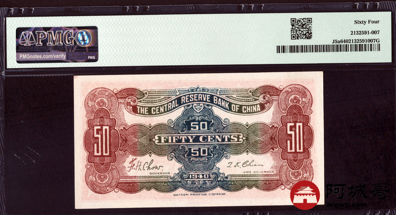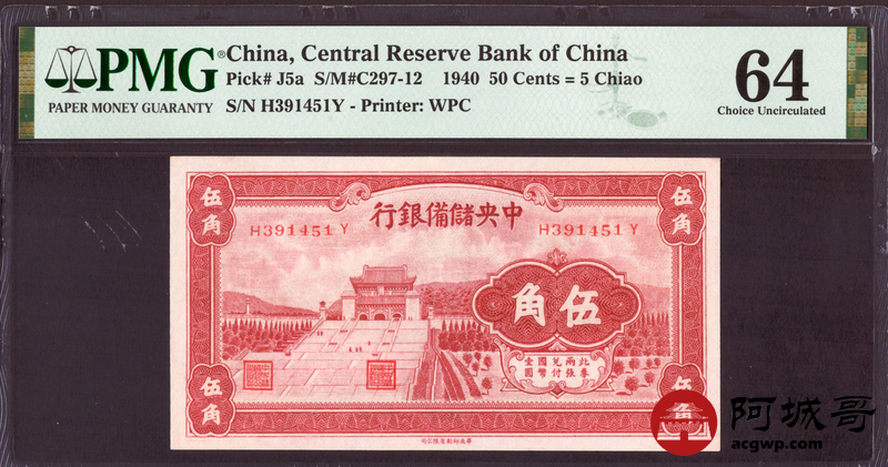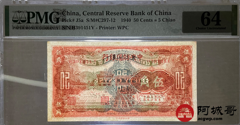Lot:46 1940年 中央储备银行 伍角 PMG 64
