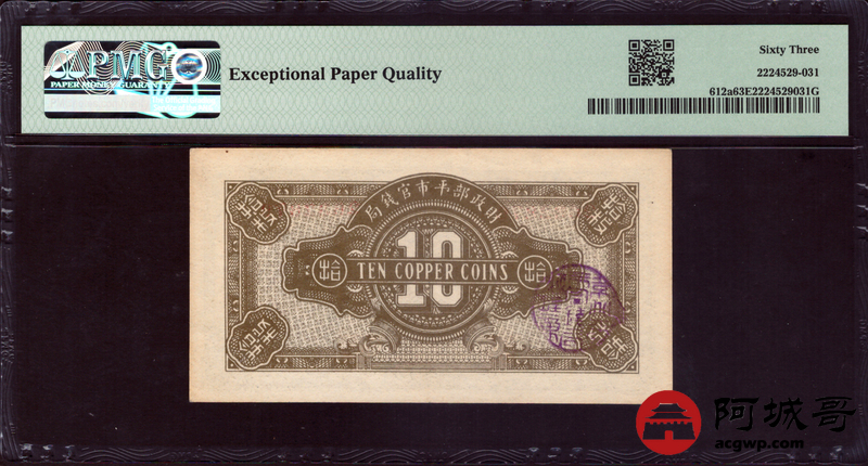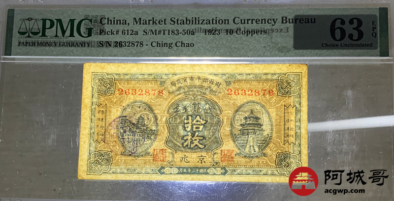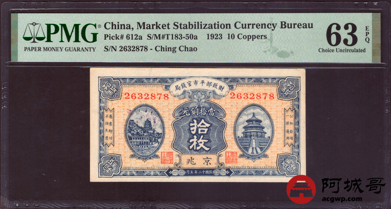 Lot:5 民国12年 财政部平市官钱局 当拾铜圆 拾枚 PMG 63EPQ