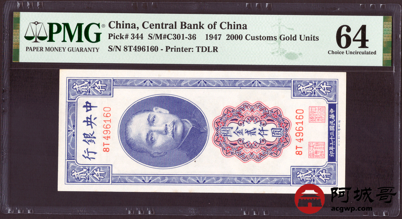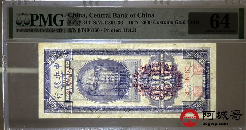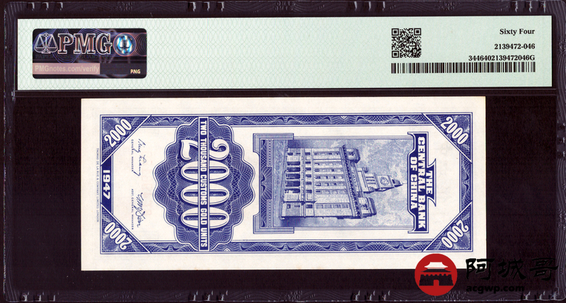 Lot:39 民国36年 中央银行 关金贰仟圆 PMG 64
