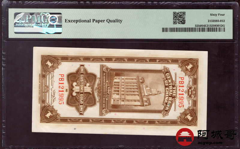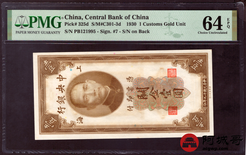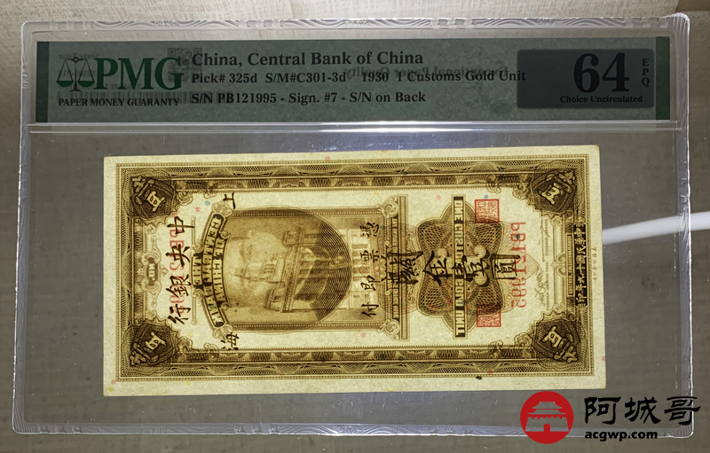 Lot:49 民国19年 中央银行 上海地名 关金壹圆 PMG 64EPQ