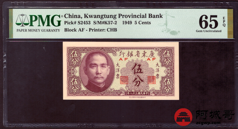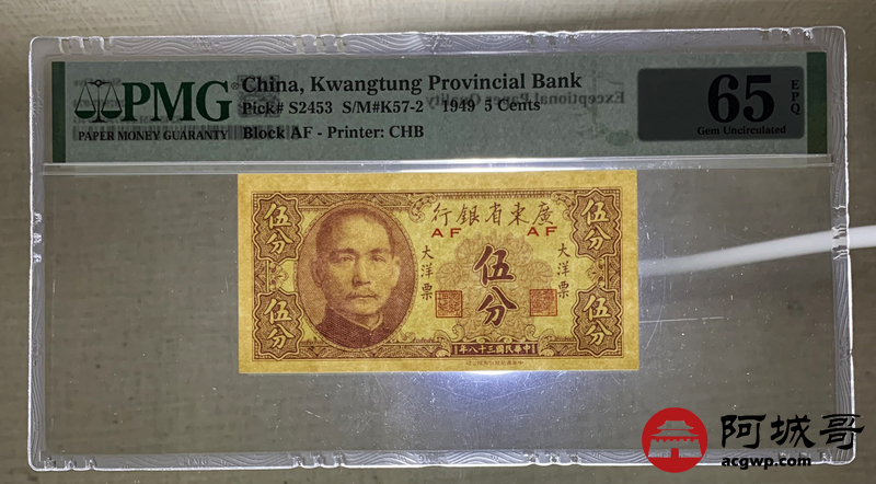 Lot:23 民国38年 广东省银行 伍分 PMG 65EPQ