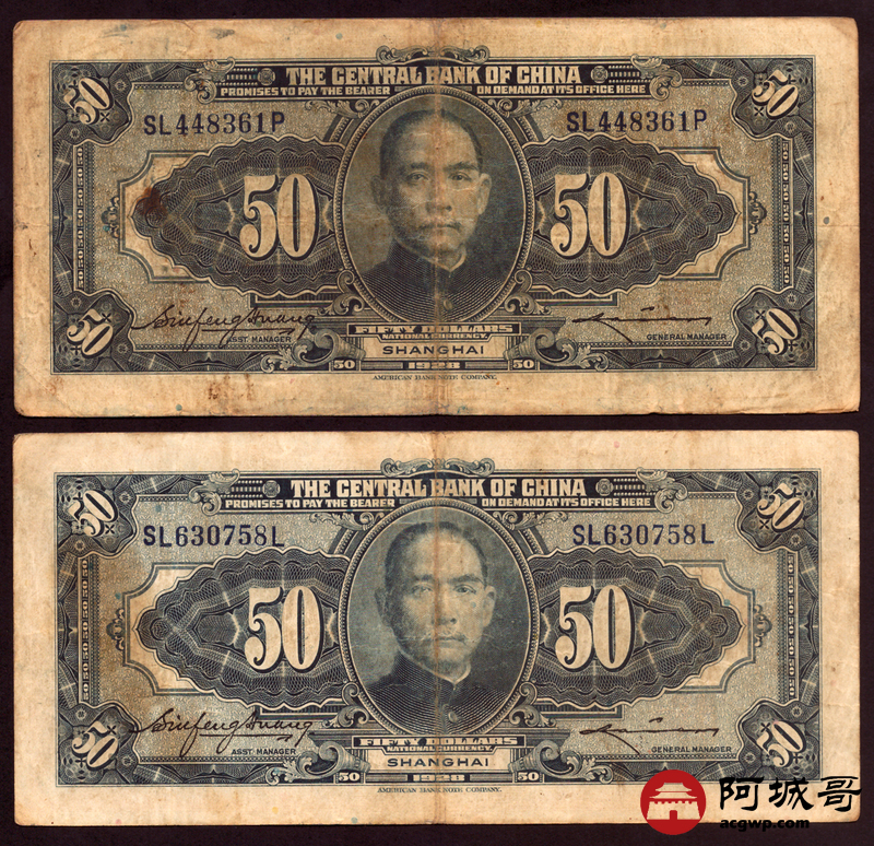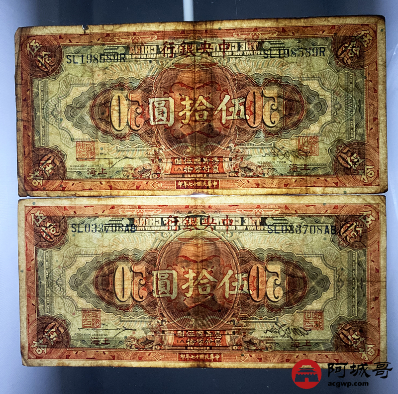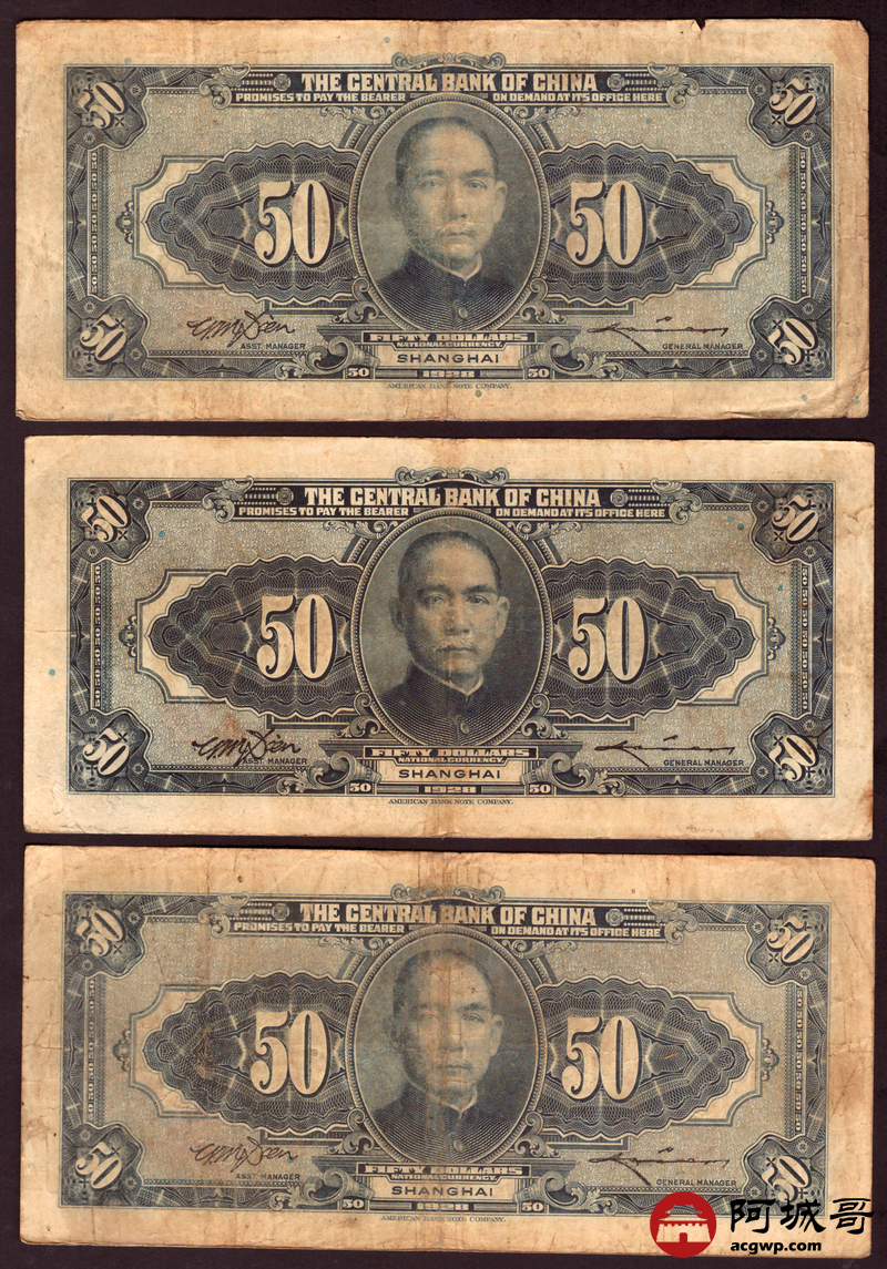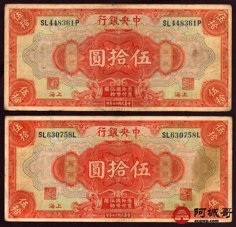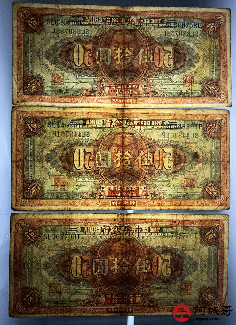 Lot:16 民国十七年 中央银行 伍拾圆 五张 69至7成新