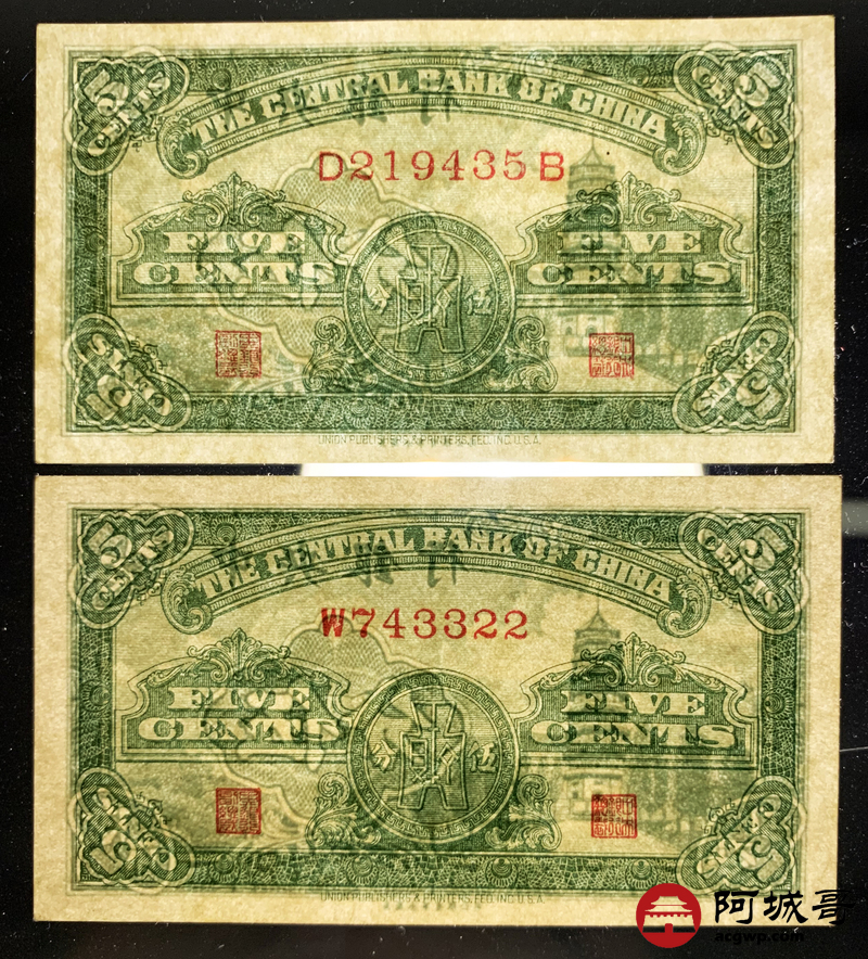 Lot:20 民国28年 中央银行 伍分 两张 原票93成新