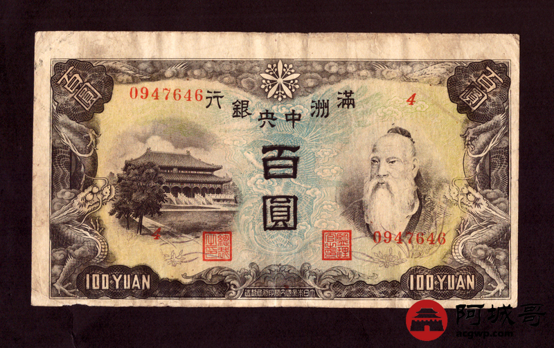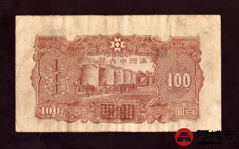 Lot:37 满洲中央银行 百圆 69至7成新