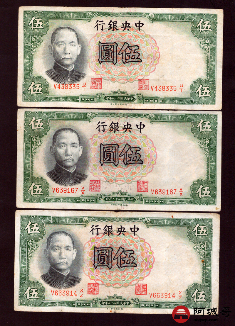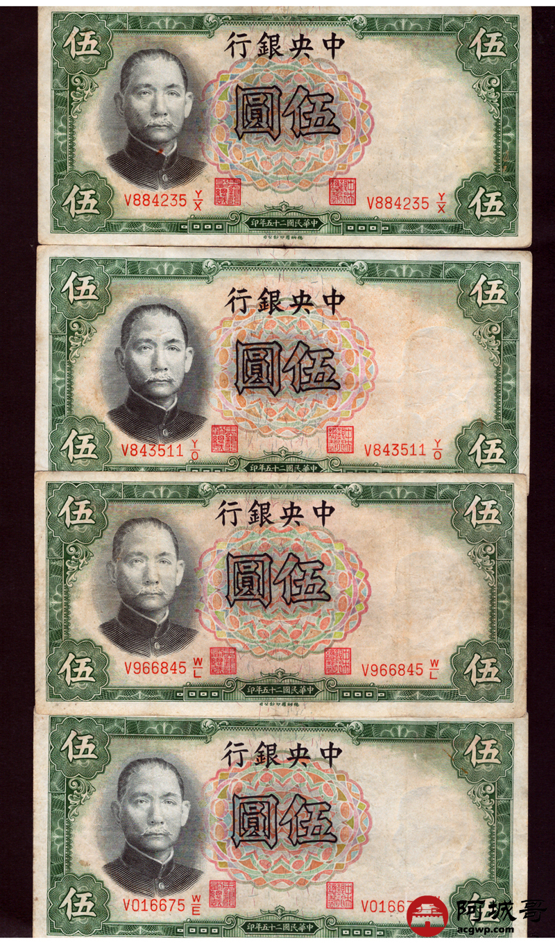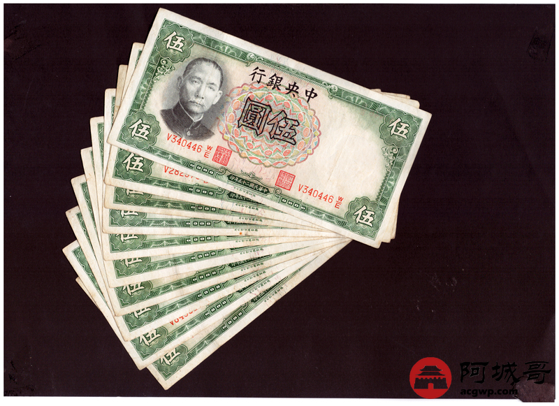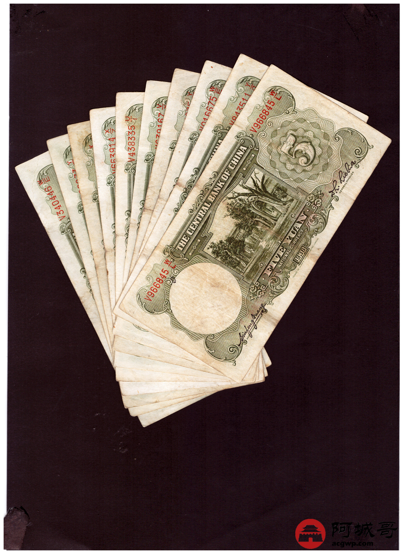 Lot:43 民国25年 中央银行 伍圆 10张 7至72成新