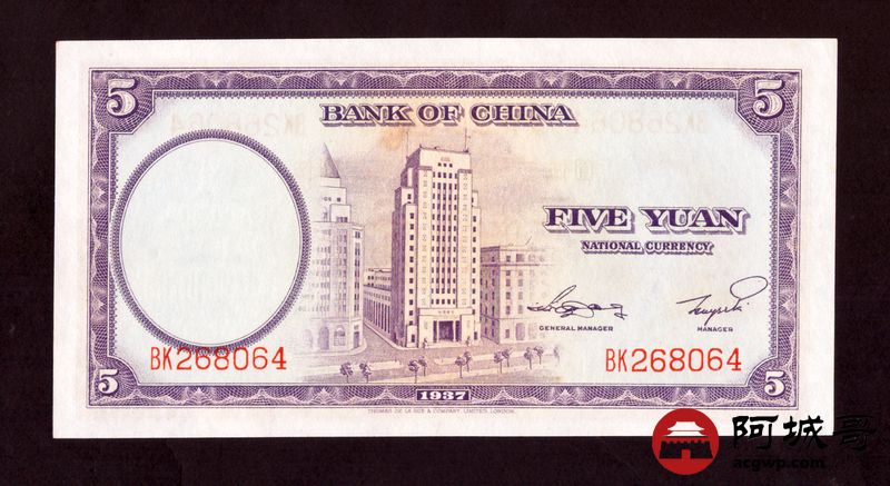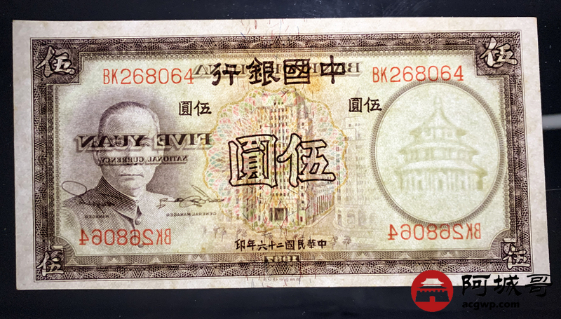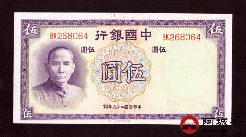 Lot:47 民国二十六年 中国银行 伍圆 94成新