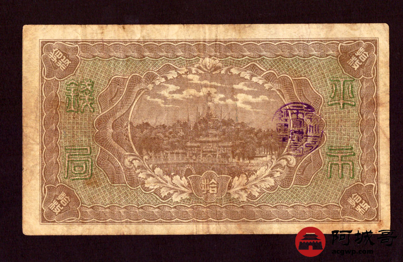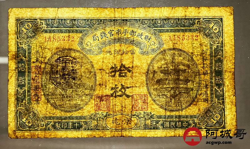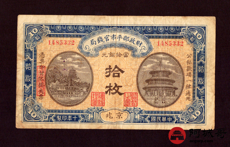 Lot:67 民国10年 财政部平市官钱局 拾枚 京兆地名 72成新