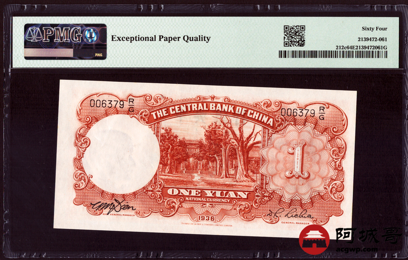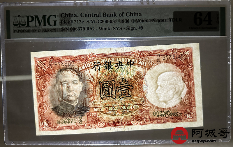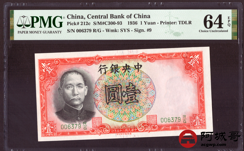 Lot:15 民国25年 中央银行 壹圆 PMG 64EPQ 好号无4 签名较少见