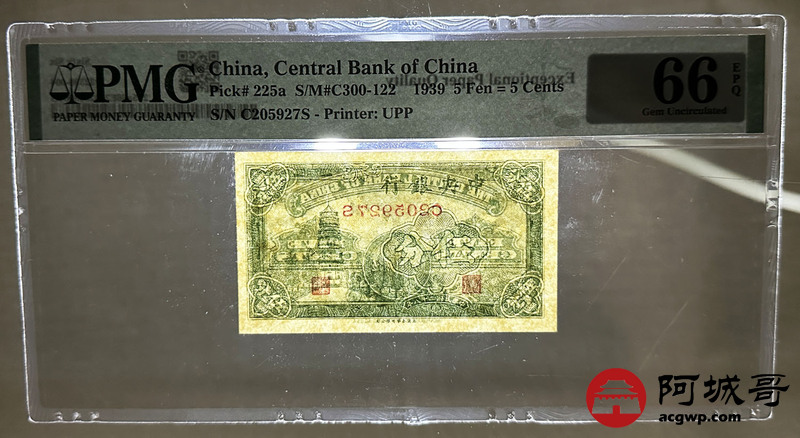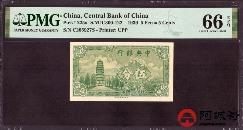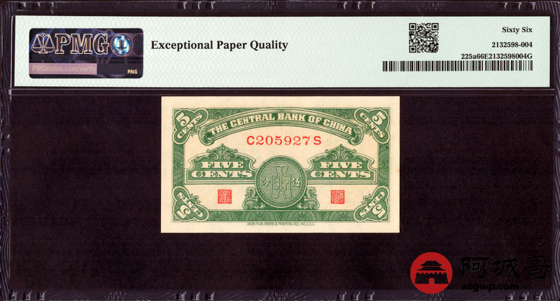 Lot:9 民国28年 中央银行 伍分 PMG 66EPQ 好号无4