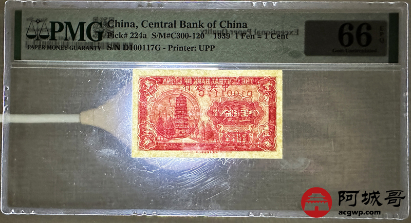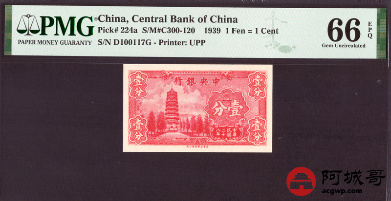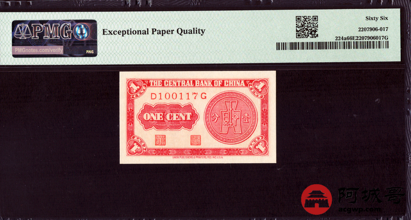 Lot:12 民国28年 中央银行 壹分 PMG 66EPQ 数三号、好号无4