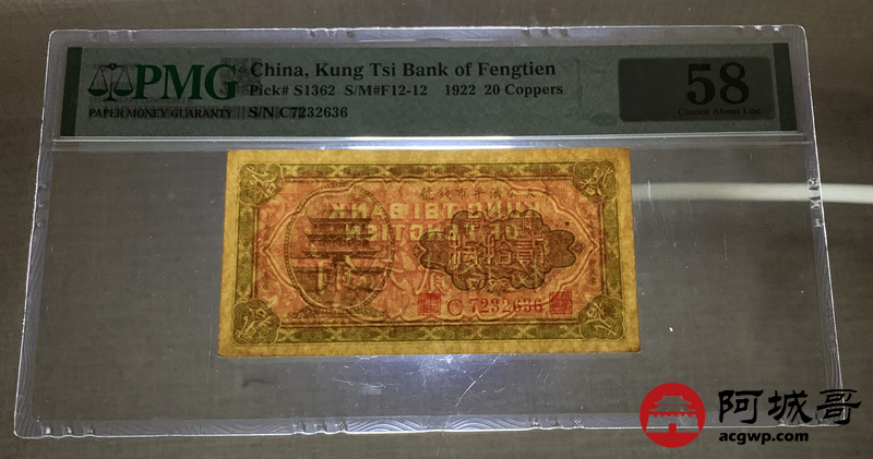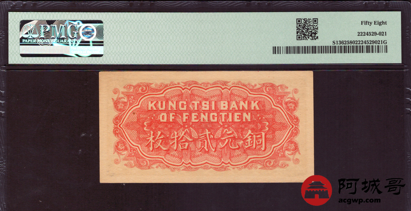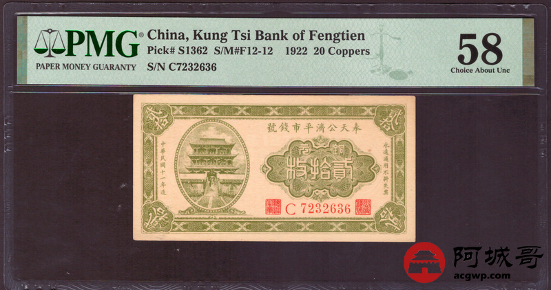 Lot:46 民国十一年 奉天公济平市钱号 贰拾枚 PMG 58