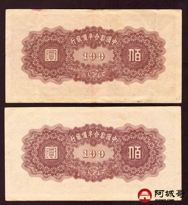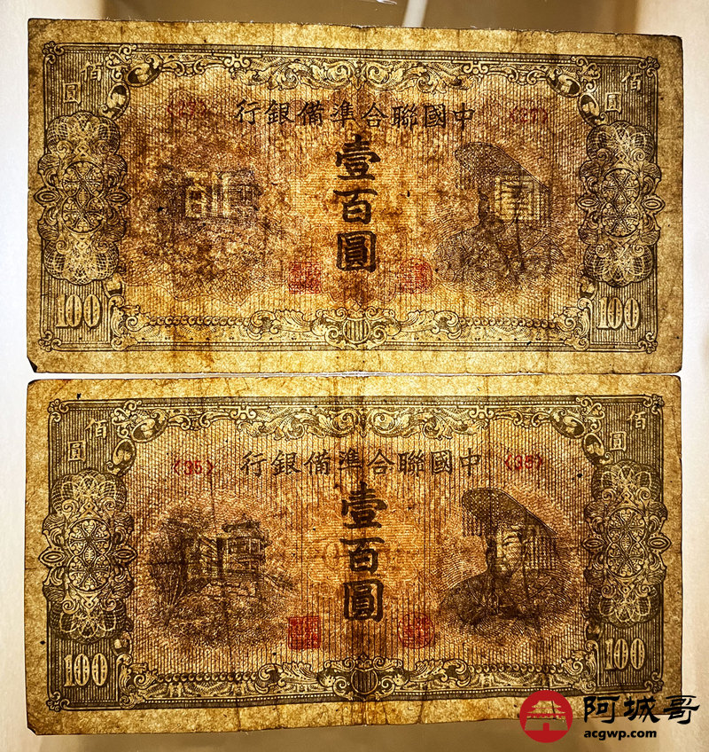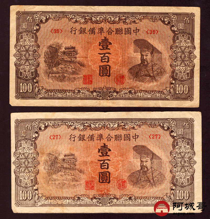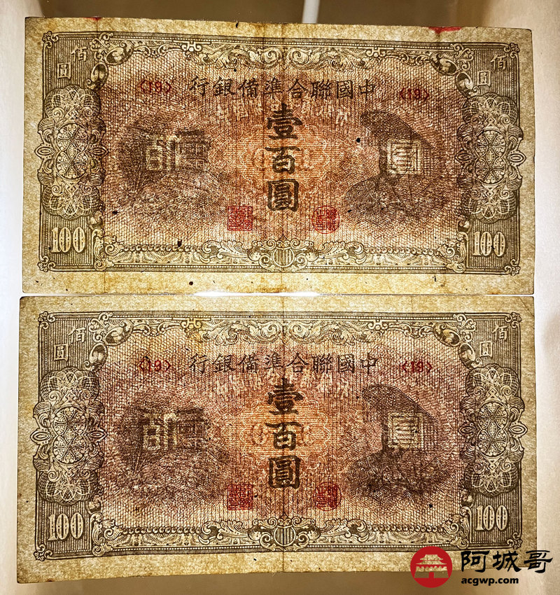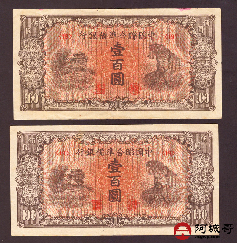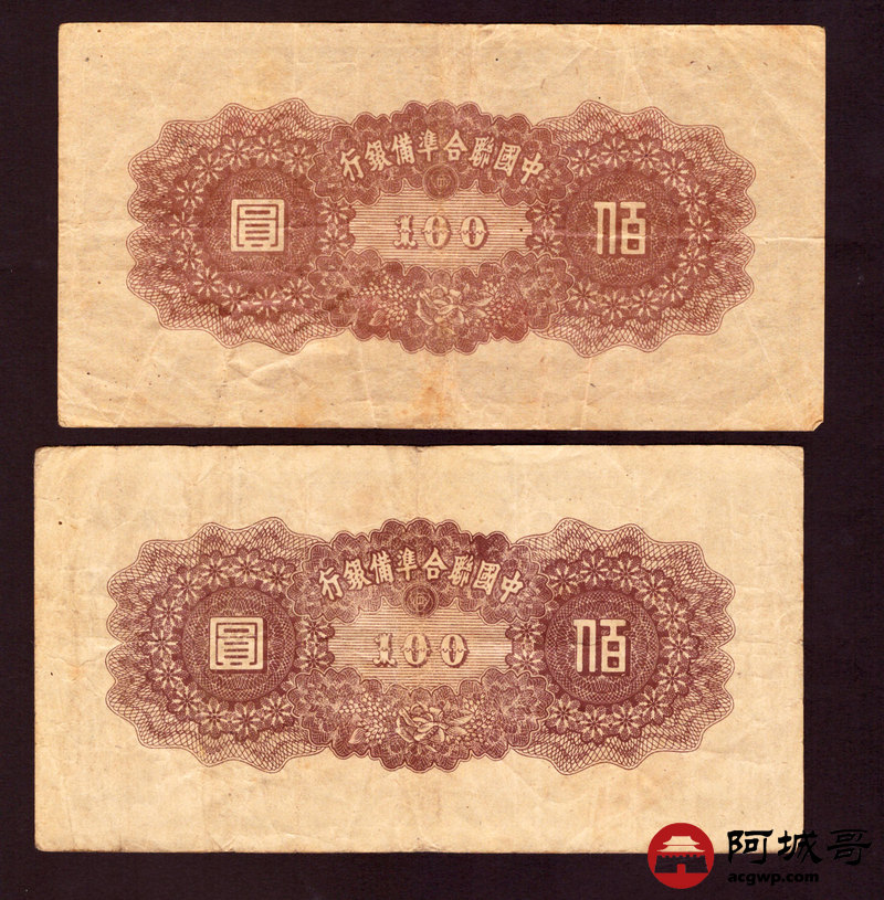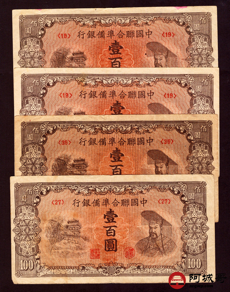 Lot:42 民国时期 中国联合准备银行 壹佰圆 4张 从上至下:7成新、85成新、75成新、74成新