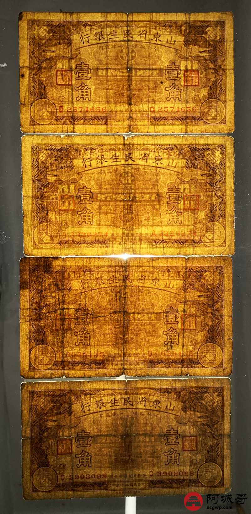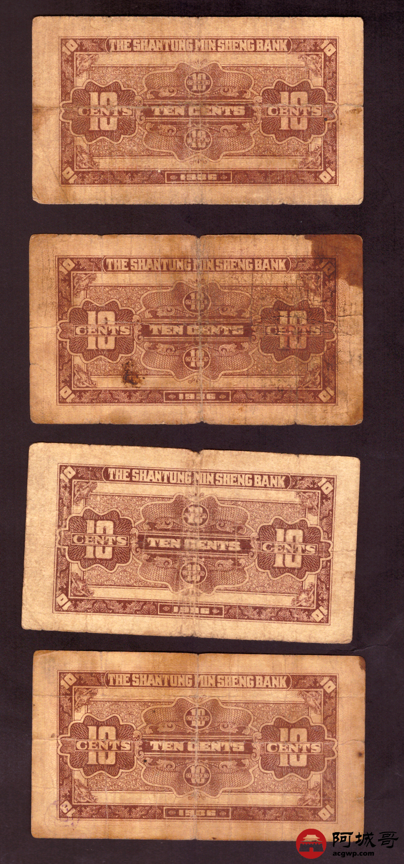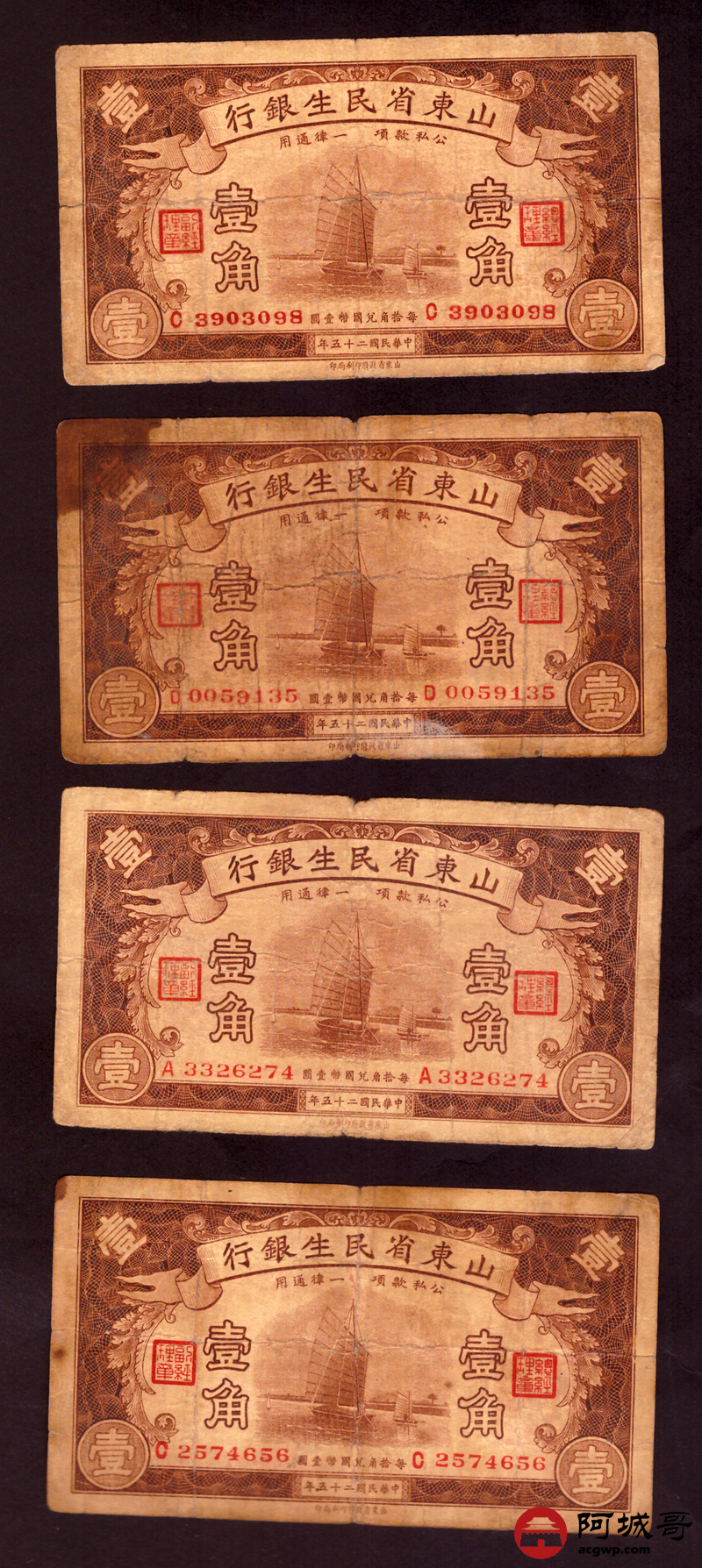 Lot:43 民国二十五年 山东省民生银行 壹角 4张 68成新