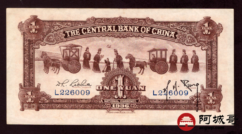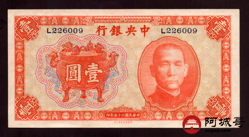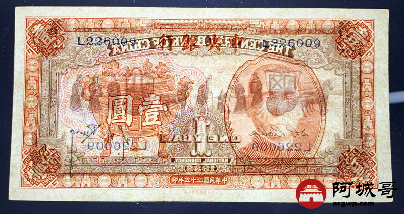Lot:4 民国25年 中央银行红宝鼎壹圆 朦胧号85成新