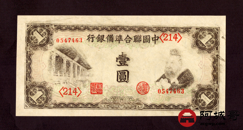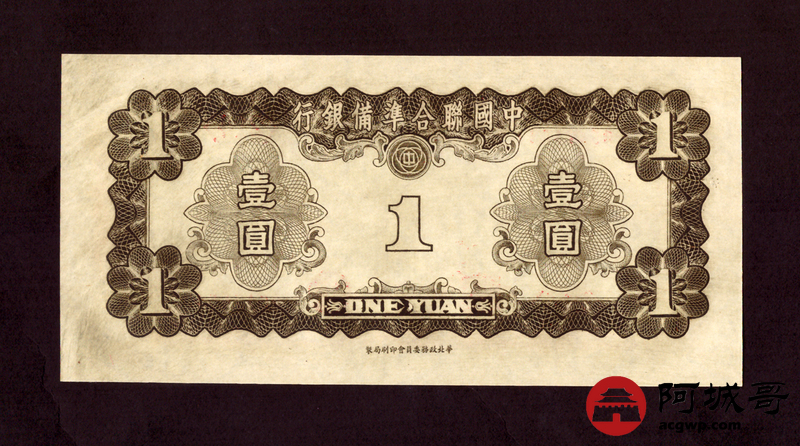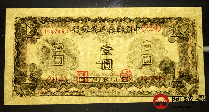 Lot:3 中国联合准备银行 壹圆 原票 细孔 95成新