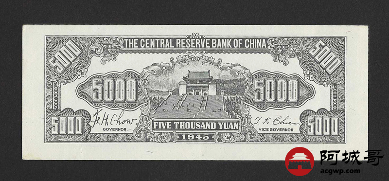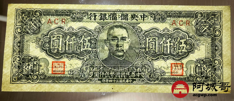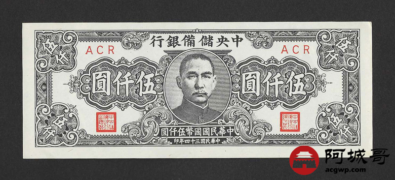 Lot:48 民国三十四年 中央储备银行 伍仟圆 原票9至92成新