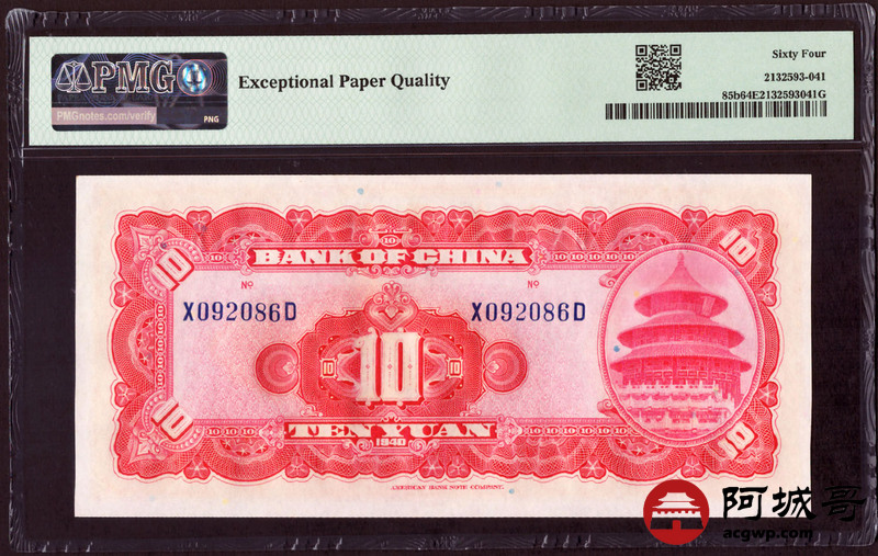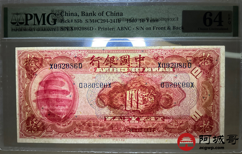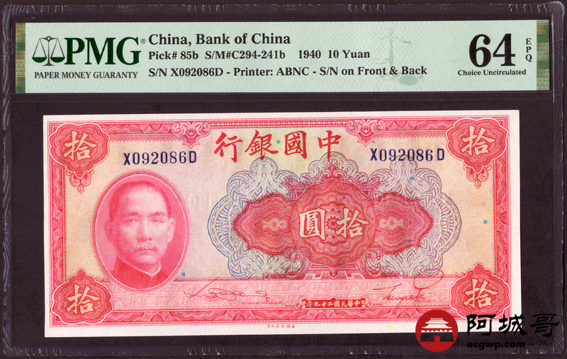 Lot:21 民国29年 中国银行 拾圆 PMG 64EPQ 朦胧号