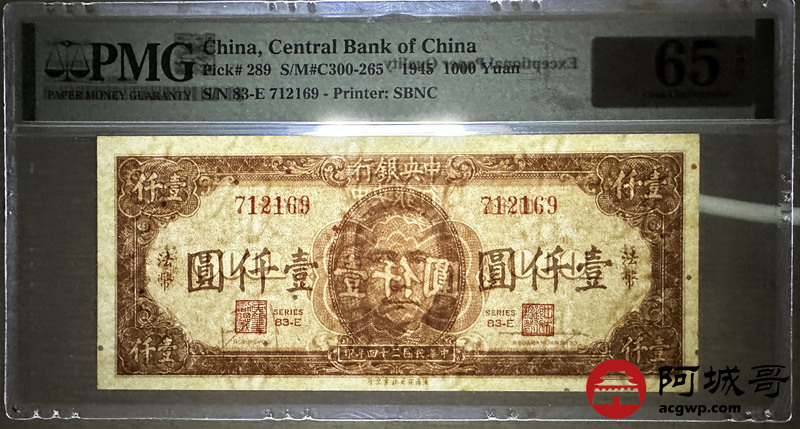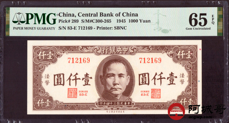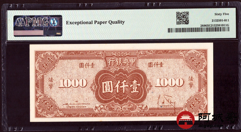 Lot:49 民国34年 中央银行 壹仟圆 PMG 65EPQ 好号无4
