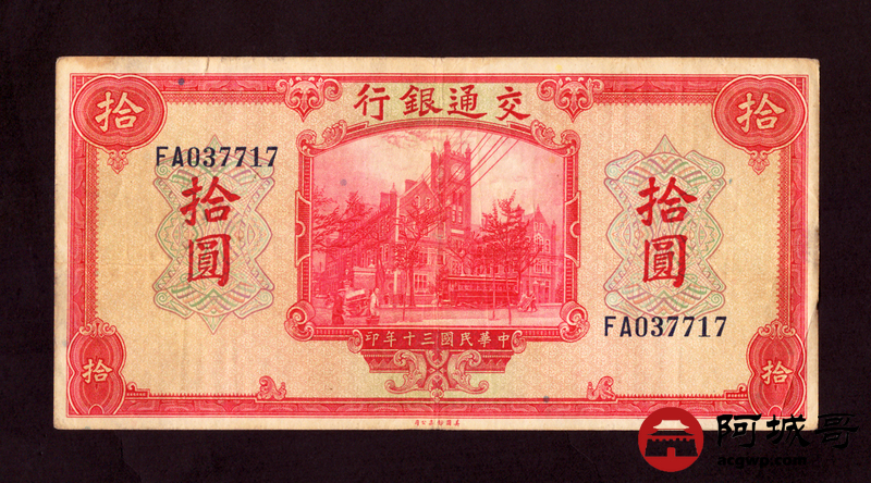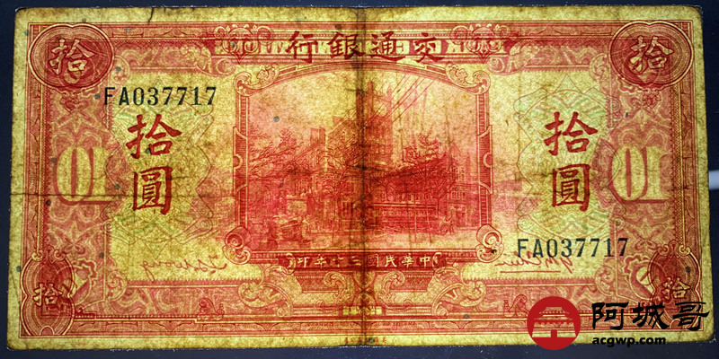 Lot:64 民国三十年 交通银行 拾圆 板子硬7成新