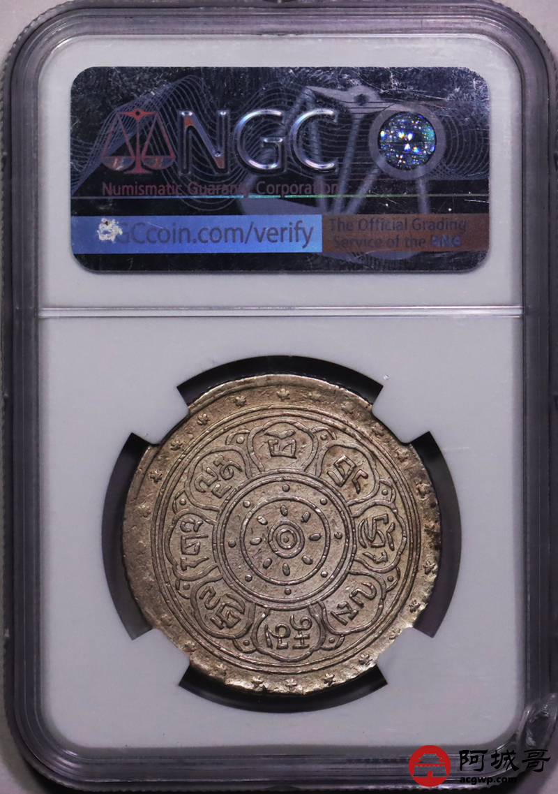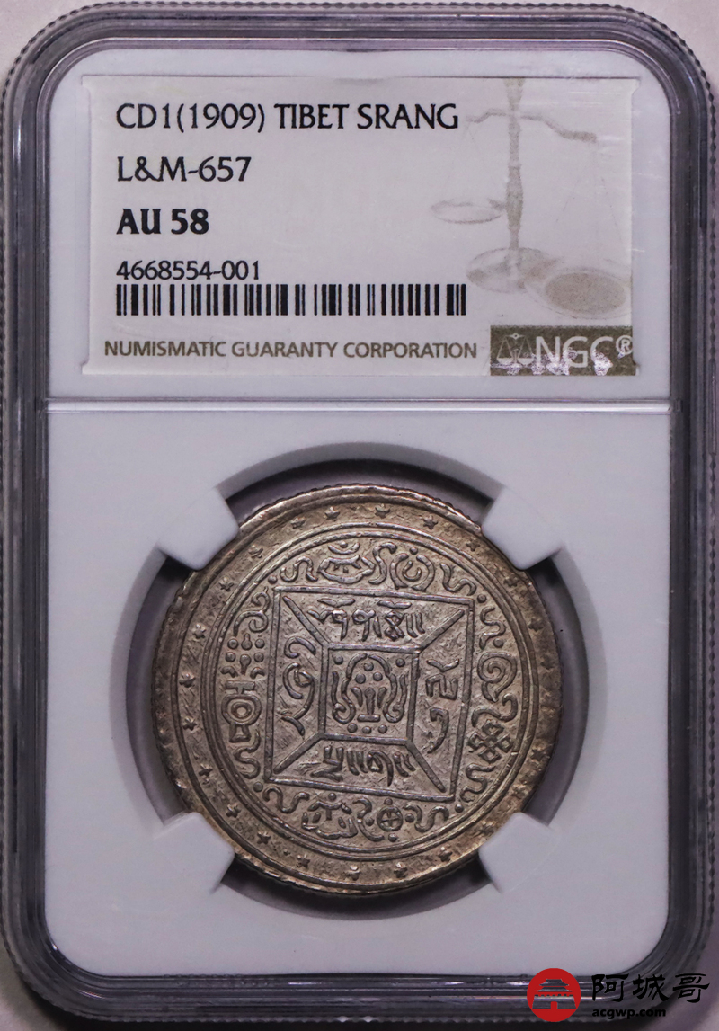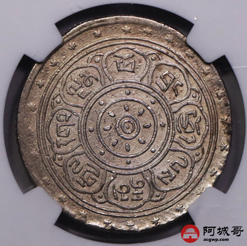 Lot:27 1909年西藏宣统大方块桑康果木一两银币 NGC AU58