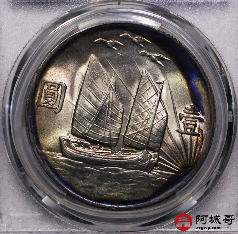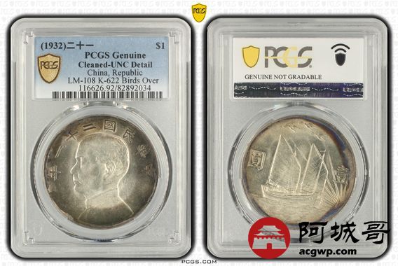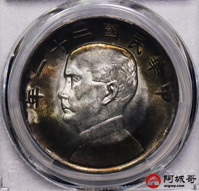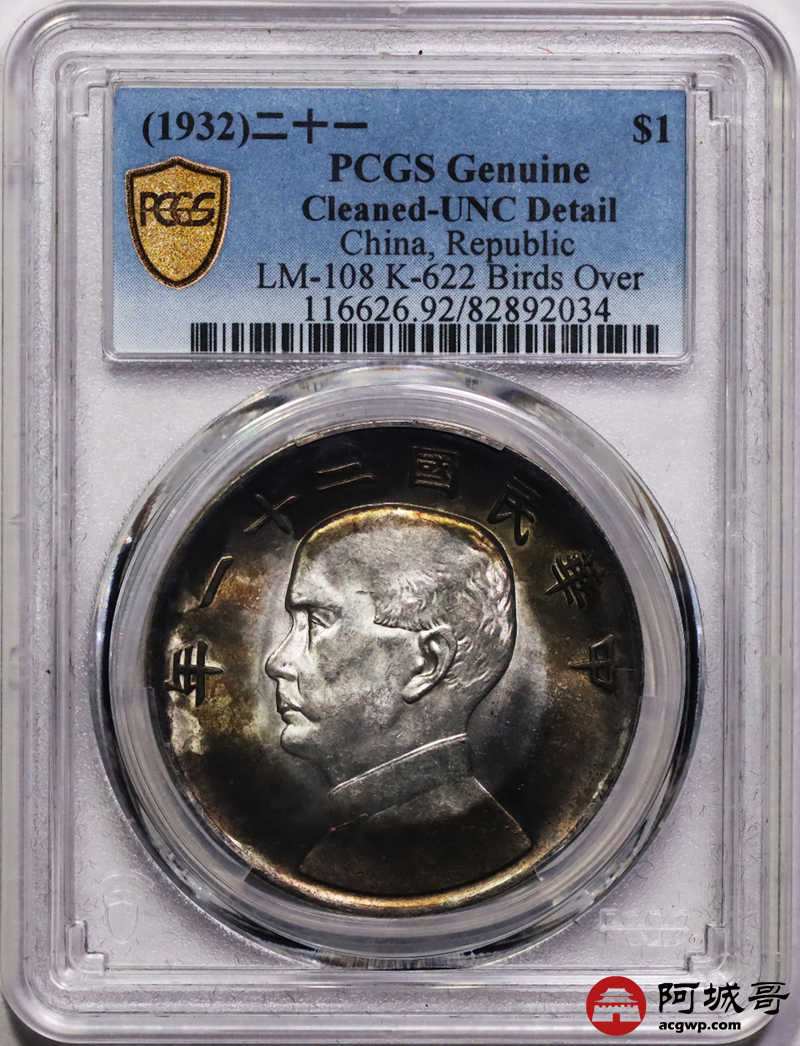 Lot:12 环彩原光 民国二十一年孙像三鸟壹圆 PCGS UNC